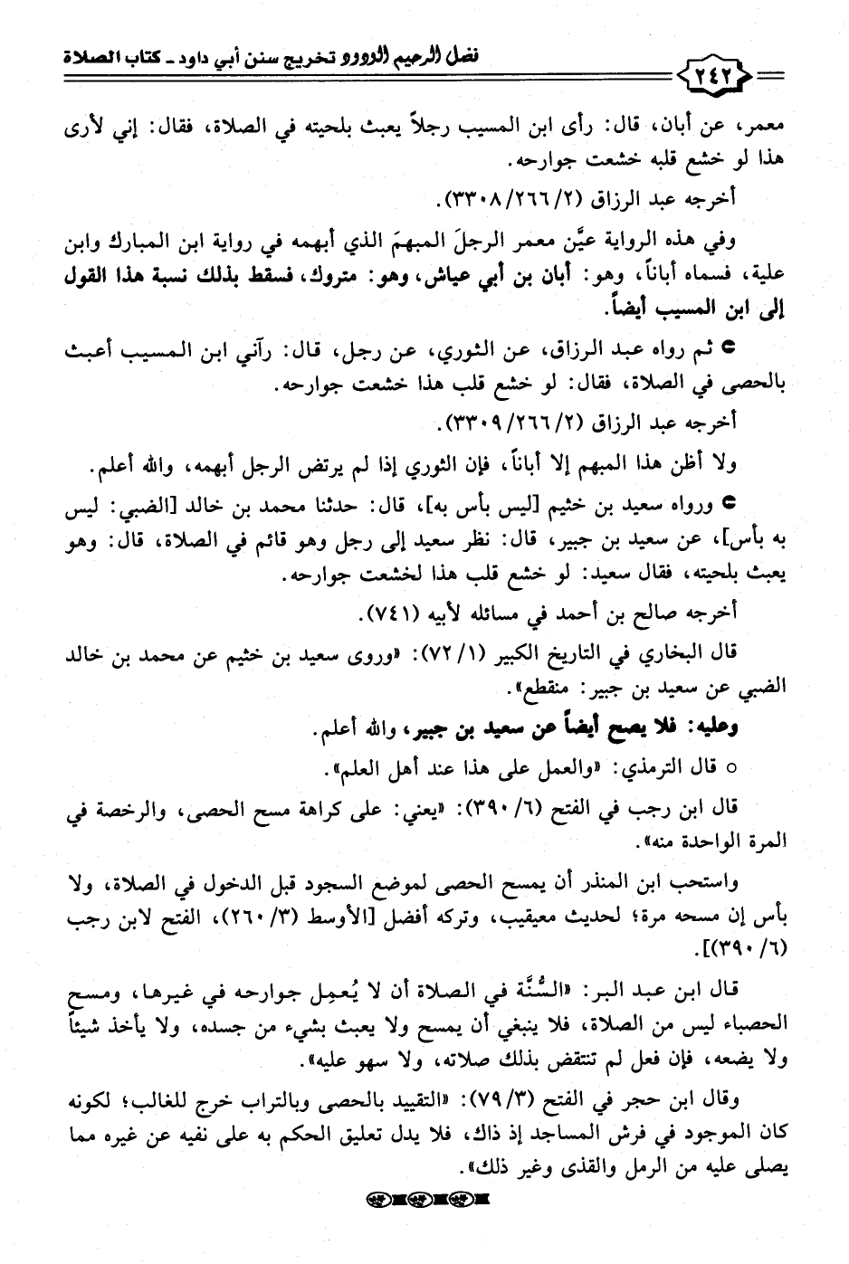 • ثم رواه عبد الرزاق، عن الثوري، عن رجل، قال: رآني ابن المسيب أعبث بالحصى في الصلاة، فقال: لو خشع قلب هذا خشعت جوارحه.