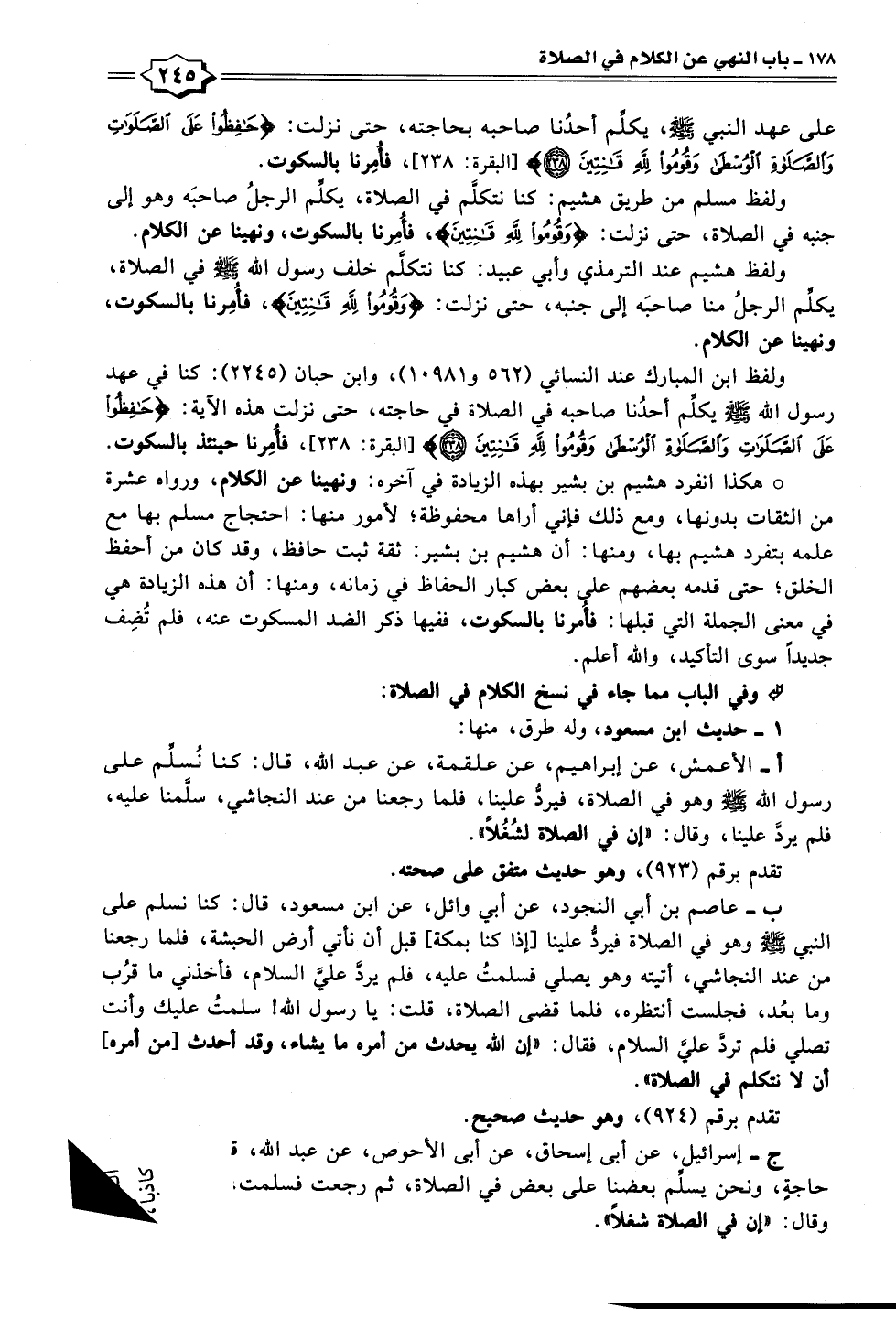 ب- عاصم بن أبي النجود، عن أبي وائل، عن ابن مسعود، قال: كنا نسلم على النبي - صلى الله عليه وسلم - وهو في الصلاة فيردُّ علينا [إذا كنا بمكة] قبل أن نأتي أرض الحبشة، فلما رجعنا من عند النجاشي، أتيته وهو يصلي فسلمتُ عليه، فلم يردَّ عليَّ السلام، فأخذني ما قرُب وما بعُد، فجلست أنتظره، فلما قضى الصلاة، قلت: يا رسول الله! سلمتُ عليك وأنت تصلي فلم تردَّ عليَّ السلام، فقال: "إن الله يحدث من أمره ما يشاء، وقد أحدث [من أمره] أن لا نتكلم في الصلاة".