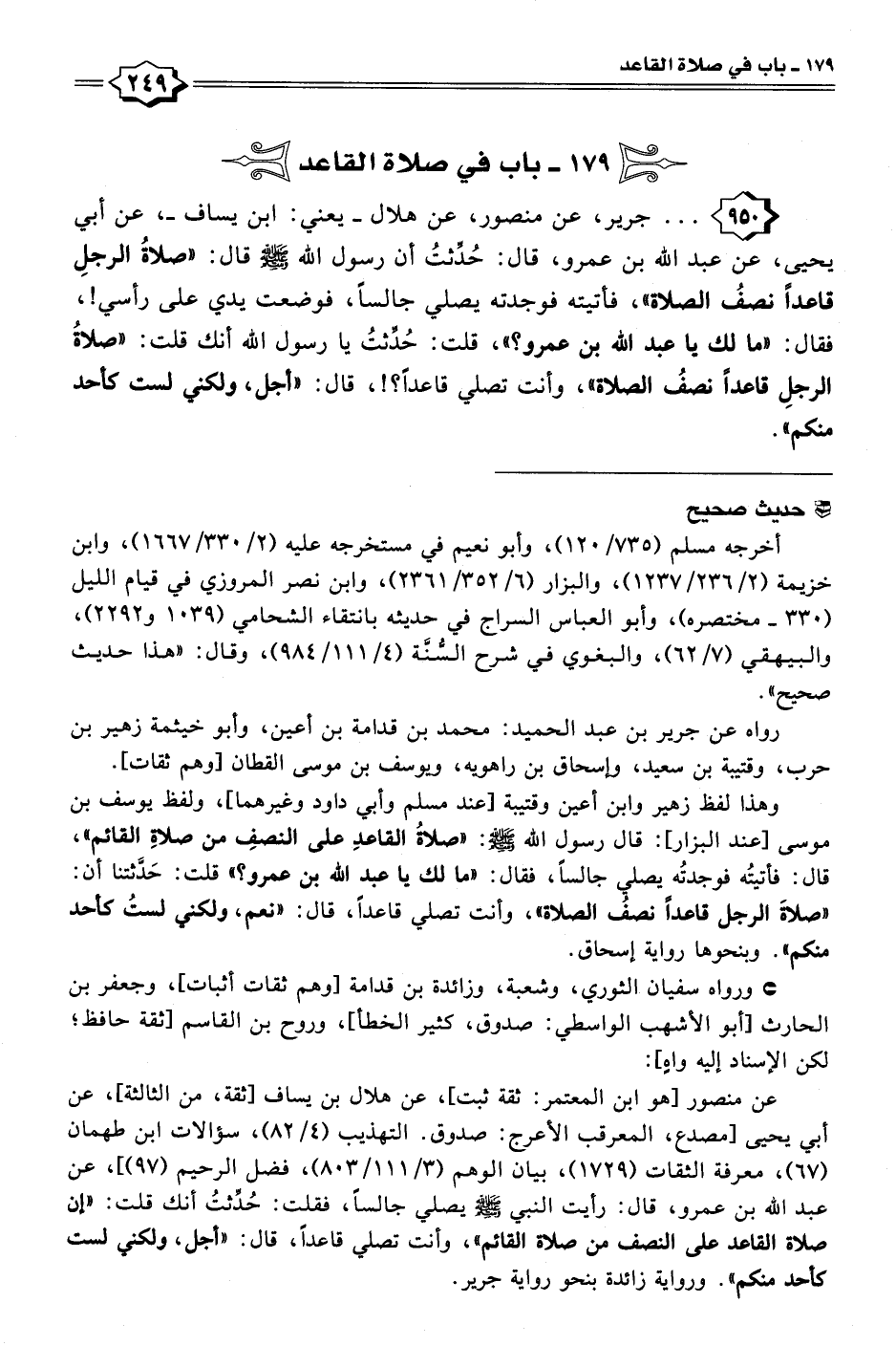 ٩٥٠ - . . . جرير، عن منصور، عن هلال -يعني: ابن يساف-، عن أبي يحيى، عن عبد الله بن عمرو، قال: حُدِّثتُ أن رسول الله - صلى الله عليه وسلم - قال: "صلاةُ الرجلِ قاعدًا نصفُ الصلاة"، فأتيته فوجدته يصلي جالسًا، فوضعت يدي على رأسي!، فقال: "ما لك يا عبد الله بن عمرو؟ "، قلت: حُدِّثتُ يا رسول الله أنك قلت: "صلاةُ الرجلِ قاعدًا نصفُ الصلاة"، وأنت تصلي قاعدًا؟!، قال: "أجل، ولكني لست كأحد منكم".