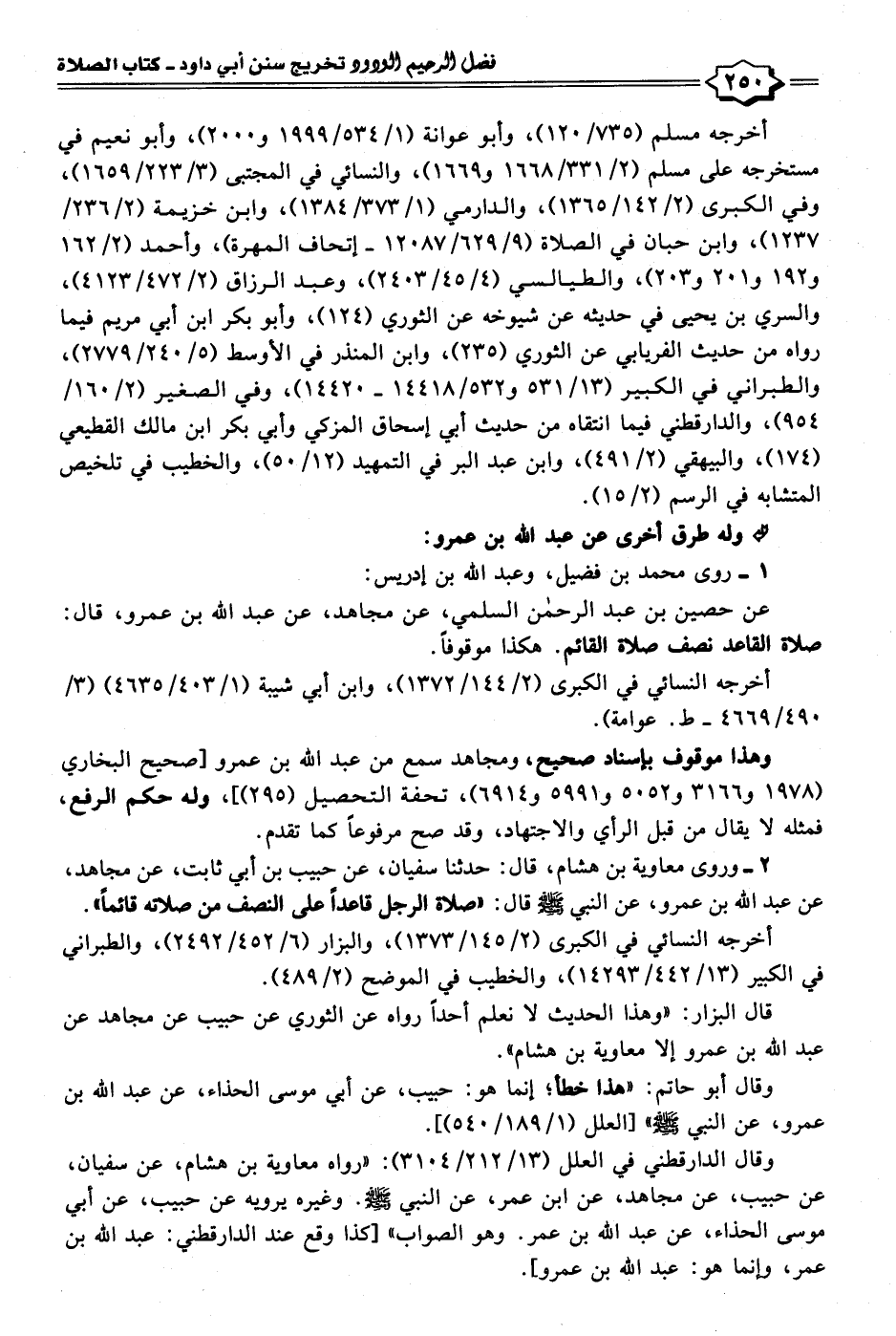 ٢ - وروى معاوية بن هشام، قال: حدثنا سفيان، عن حبيب بن أبي ثابت، عن مجاهد، عن عبد الله بن عمرو، عن النبي - صلى الله عليه وسلم - قال: "صلاة الرجل قاعدًا على النصف من صلاته قائمًا".