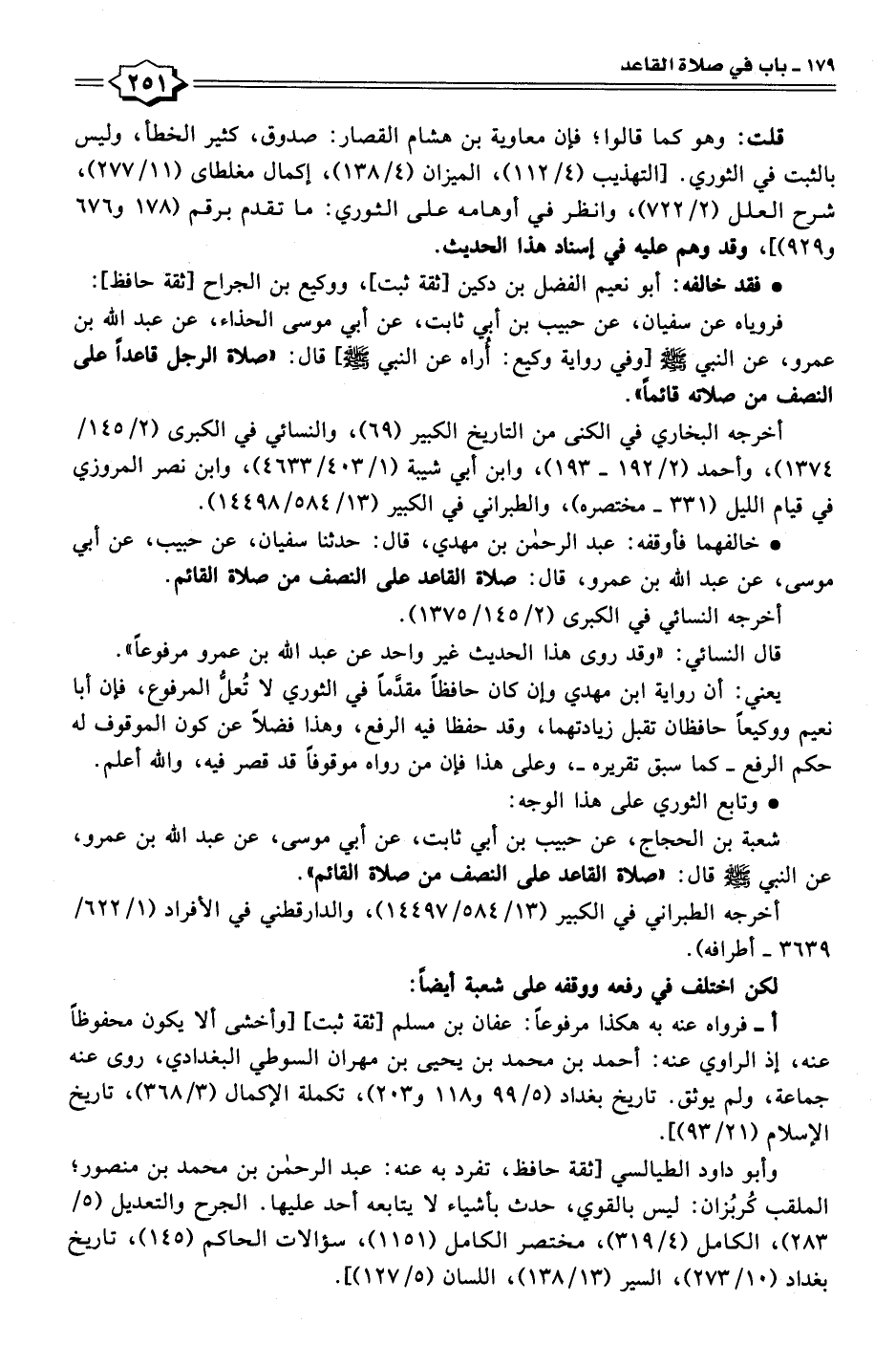 • خالفهما فأوقفه: عبد الرحمن بن مهدي، قال: حدثنا سفيان، عن حبيب، عن أبي موسى، عن عبد الله بن عمرو، قال: صلاة القاعد على النصف من صلاة القائم.
