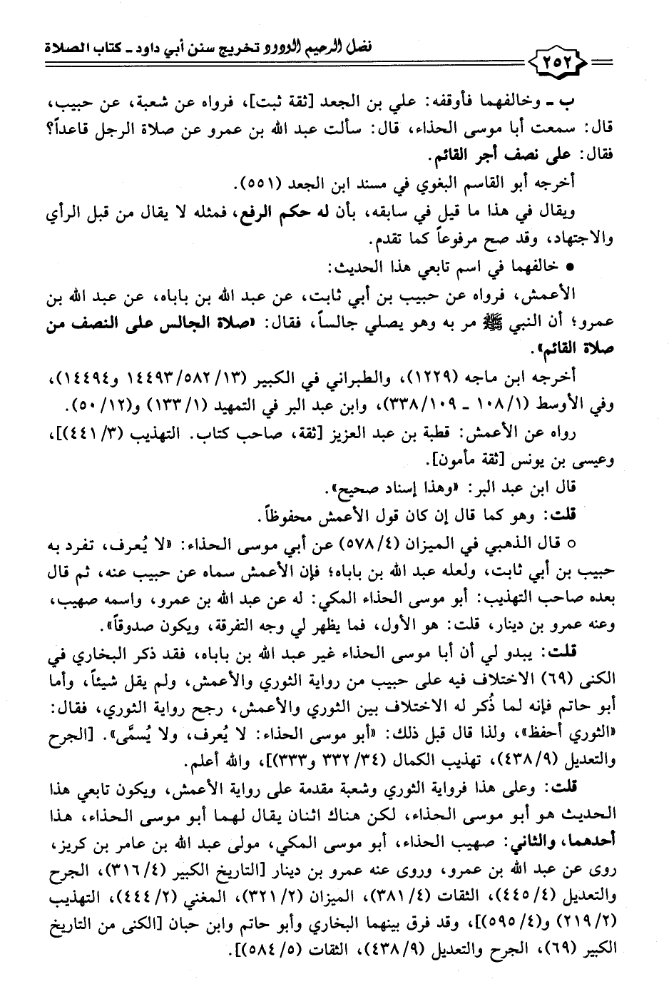 ب- وخالفهما فأوقفه: علي بن الجعد [ثقة ثبت]، فرواه عن شعبة، عن حبيب، قال: سمعت أبا موسى الحذاء، قال: سألت عبد الله بن عمرو عن صلاة الرجل قاعدًا؟ فقال: على نصف أجر القائم.