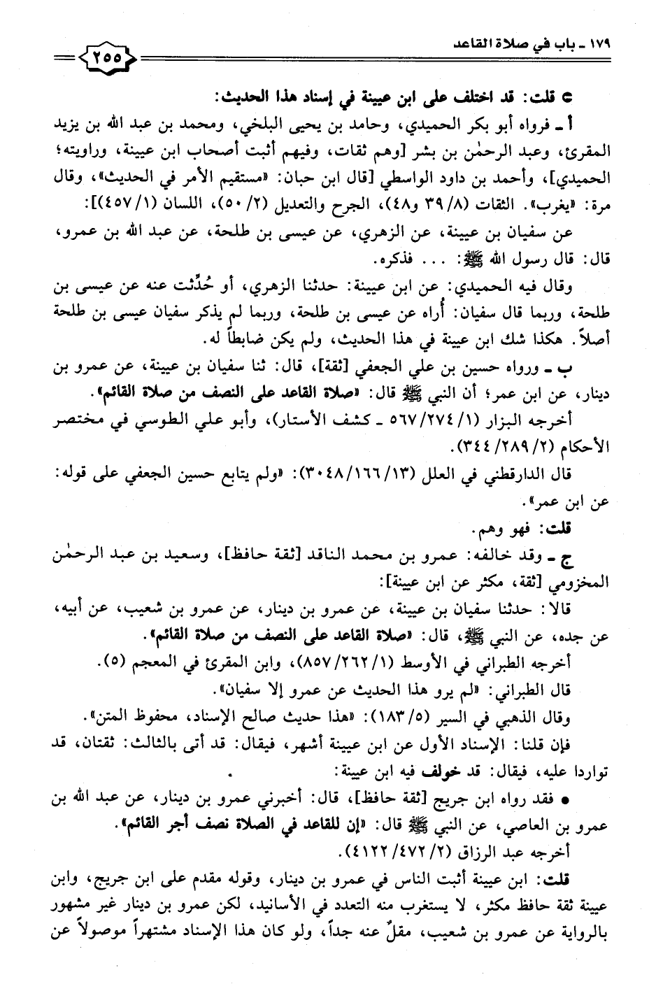 ب- ورواه حسين بن علي الجعفي [ثقة]، قال: ثنا سفيان بن عيينة، عن عمرو بن دينار، عن ابن عمر؛ أن النبي - صلى الله عليه وسلم - قال: "صلاة القاعد على النصف من صلاة القائم".