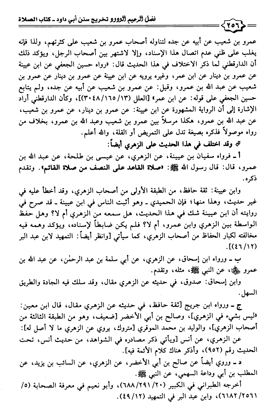 أ- فرواه سفيان بن عيينة، عن الزهري، عن عيسى بن طلحة، عن عبد الله بن عمرو، قال: قال رسول الله - صلى الله عليه وسلم -: "صلاة القاعد على النصف من صلاة القائم". وتقدم ذكره.