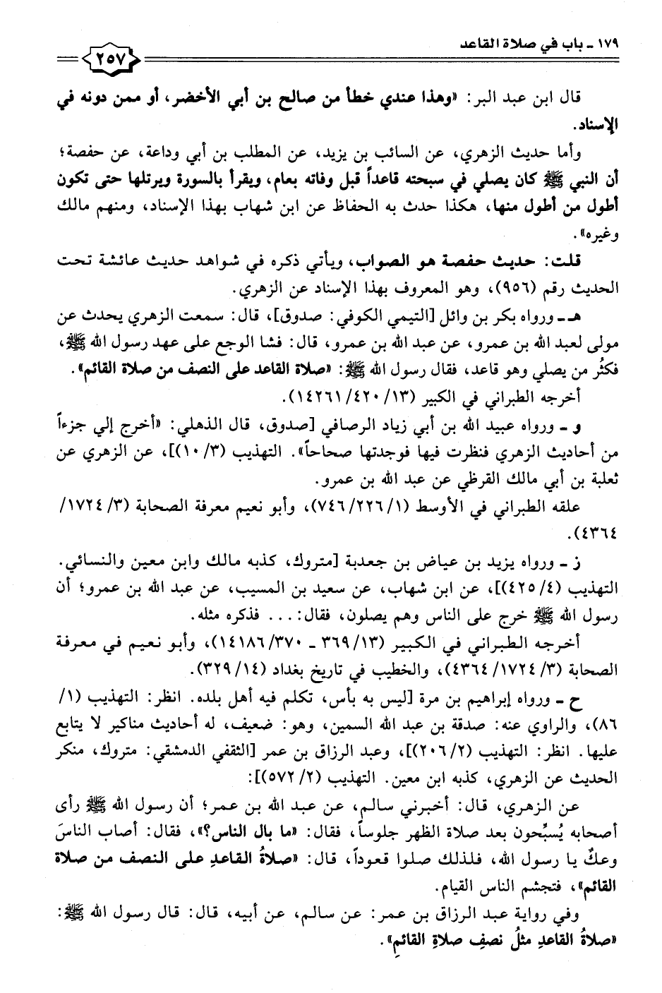 هـ- ورواه بكر بن وائل [التيمي الكوفي: صدوق]، قال: سمعت الزهري يحدث عن مولى لعبد الله بن عمرو، عن عبد الله بن عمرو، قال: فشا الوجع على عهد رسول الله - صلى الله عليه وسلم -، فكثُر من يصلي وهو قاعد، فقال رسول الله - صلى الله عليه وسلم -: "صلاة القاعد على النصف من صلاة القائم".