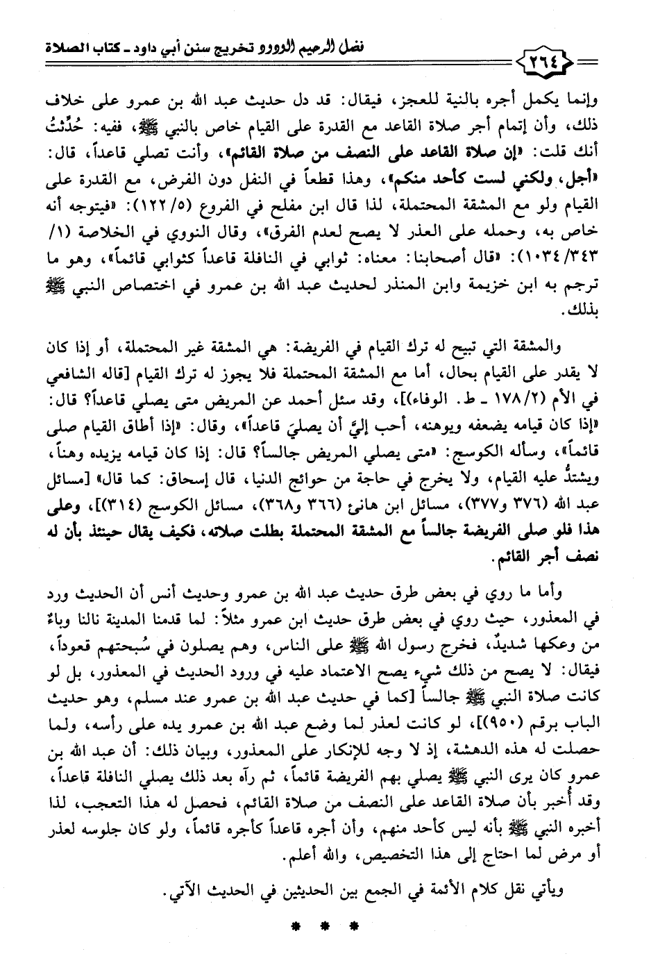 وإنما يكمل أجره بالنِّيَّة للعجز، فيقال: قد دل حديث عبد الله بن عمرو على خلاف ذلك، وأن إتمام أجر صلاة القاعد مع القدرة على القيام خاص بالنبي - صلى الله عليه وسلم -، ففيه: حُدِّثتُ أنك قلت: "إن صلاة القاعد على النصف من صلاة القائم"، وأنت تصلي قاعدًا، قال: "أجل، ولكني لست كأحد منكم"، وهذا قطعًا في النفل دون الفرض، مع القدرة على القيام ولو مع المشقة المحتملة، لذا قال ابن مفلح في الفروع (٥/ ١٢٢): "فيتوجه أنَّه خاص به، وحمله على العذر لا يصح لعدم الفرق"، وقال النووي في الخلاصة (١/ ٣٤٣/ ١٠٣٤): "قال أصحابنا: معناه: ثوابي في النافلة قاعدًا كثوابي قائمًا"، وهو ما ترجم به ابن خزيمة وابن المنذر لحديث عبد الله بن عمرو في اختصاص النبي - صلى الله عليه وسلم - بذلك.