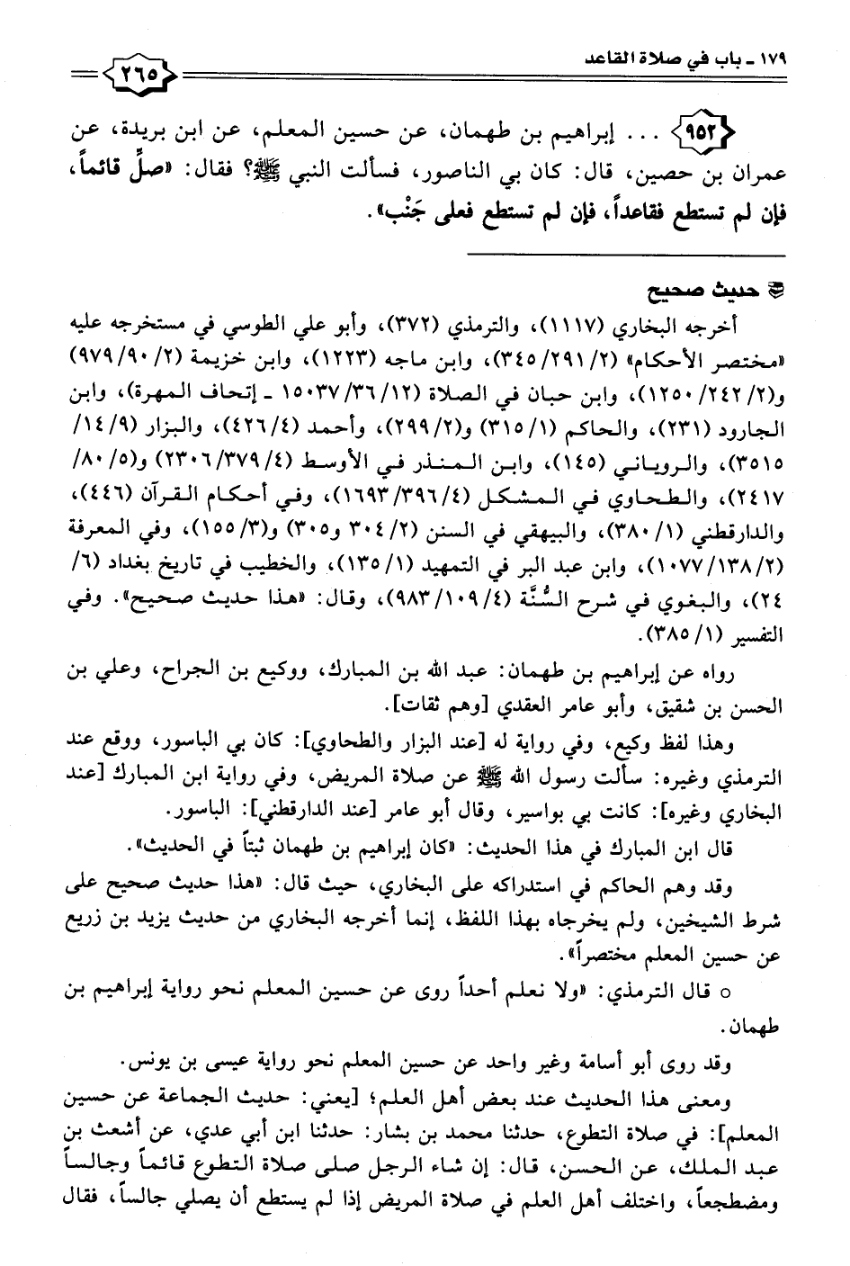 ٩٥٢ - . . . إبراهيم بن طهمان، عن حسين المعلم، عن ابن بريدة، عن عمران بن حصين، قال: كان بي الناصور، فسألت النبي - صلى الله عليه وسلم -؟؛ فقال: "صلِّ قائمًا، فإن لم تستطع فقاعدًا، فإن لم تستطع فعلى جَنْب".