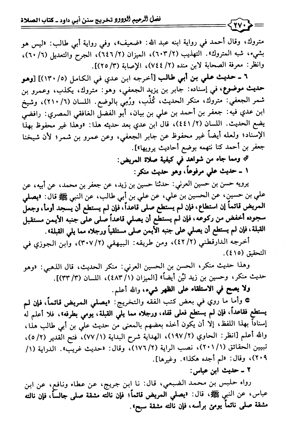 • وأما ما روي في بعض كتب الفقه والتخريج: "يصلي المريض قائمًا، فإن لم يستطع فقاعدًا، فإن لم يستطع فعلى قفاه، ورجلاه مما يلي القبلة، يومي بطرفه"، فلا أعلم له إسنادًا بهذا اللفظ، إلا أن يكون أخذه بعضهم بالمعنى من حديث علي بن أبي طالب هذا، والله أعلم [انظر: الحاوي (٢/ ١٩٧)، الهداية شرح البداية (١/ ٧٧)، فتح القدير (٢/ ٥)، تبيين الحقائق (١/ ٢٠١)، نصب الراية (٢/ ١٧٦)، وقال: "حديث غريب". الدراية (١/ ٢٠٩)، وقال: "لم أجده هكذا". وغيرها].