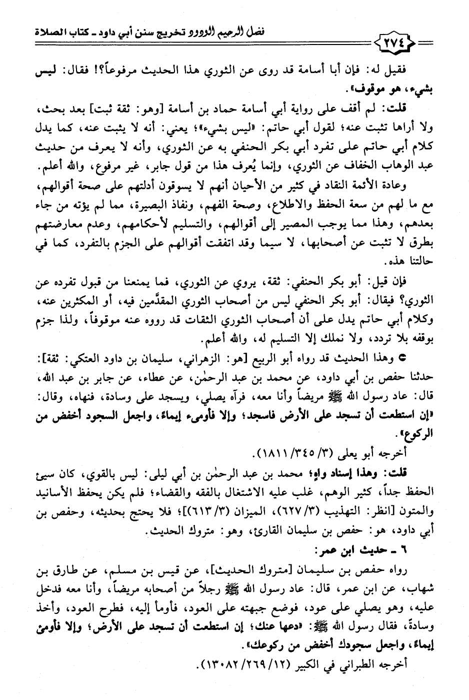رواه حفص بن سليمان [متروك الحديث]، عن قيس بن مسلم، عن طارق بن شهاب، عن ابن عمر، قال: عاد رسول الله - صلى الله عليه وسلم - رجلًا من أصحابه مريضًا، وأنا معه فدخل عليه، وهو يصلي على عود، فوضع جبهته على العود، فأومأ إليه، فطرح العود، وأخذ وسادةً، فقال رسول الله - صلى الله عليه وسلم -: "دعها عنك؛ إن استطعت أن تسجد على الأرض؛ وإلا فأومئ إيماءً، واجعل سجودك أخفض من ركوعك].