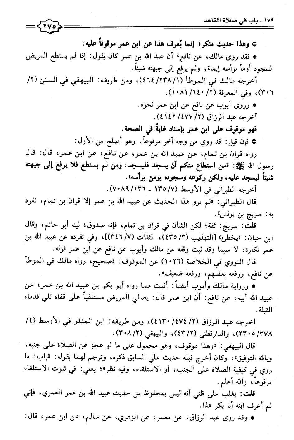 • ورواية مالك وأيوب أيضًا: أثبت مما رواه أبو بكر بن عبيد الله بن عمر، عن عبيد الله أبيه، عن نافع: أن ابن عمر قال: يصلي المريض مستلقيًا على قفاه تلي قدماه القبلة.