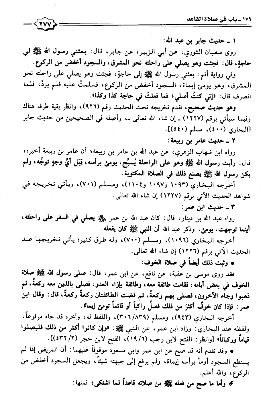 رواه عبد الله بن دينار، قال: كان عبد الله بن عمر - رضي الله عنهما - يصلي في السفر على راحلته، أينما توجهت، يومئ، وذكر عبد الله أن النبي - صلى الله عليه وسلم - كان يفعله.