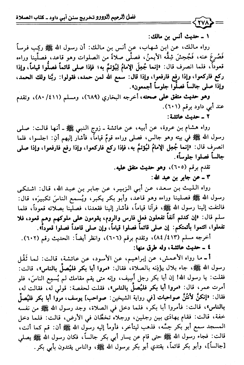 أ - ما رواه الأعمش، عن إبراهيم، عن الأسود، عن عائشة، قالت: لما ثَقُل رسول الله - صلى الله عليه وسلم -، جاء بلال يؤْذِنه بالصلاة، فقال: "مروا أبا بكر فليُصلِّ بالناس" قالت: فقلت: يا رسول الله! إن أبا بكر رجل أسِيف، وإنه متى يقم مقامك لم يُسمِع الناسَ، فلو أمرت عمر، قال: "مروا أبا بكر فليُصلِّ بالناس"، فقلت لحفصة: قولي له، فقالت له، فقال: "إنكنَّ لأنتُنَّ صواحبات [في رواية الشيخين: صواحب] يوسف، مروا أبا بكر فليُصلِّ بالناس"، قالت: فأمروا أبا بكر، فلما دخل في الصلاة، وجد رسول الله - صلى الله عليه وسلم - من نفسه خفة، قالت: فقام يهادَى بين رجلين، ورجلاه تخطَّان في الأرض، قالت: فلما دخل المسجد سمع أبو بكر حِسَّه، فذهب ليتأخر، فأومأ إليه رسول الله - صلى الله عليه وسلم - أن: قم كما أنت، قالت: فجاء رسول الله - صلى الله عليه وسلم - حتَّى قام عن يسار أبي بكر جالسًا، فكان رسول الله - صلى الله عليه وسلم - يصلي [جالسًا]، وأبو بكر قائمًا، يقتدي أبو بكر برسول الله - صلى الله عليه وسلم -، والناس يقتدون بأبي بكر.