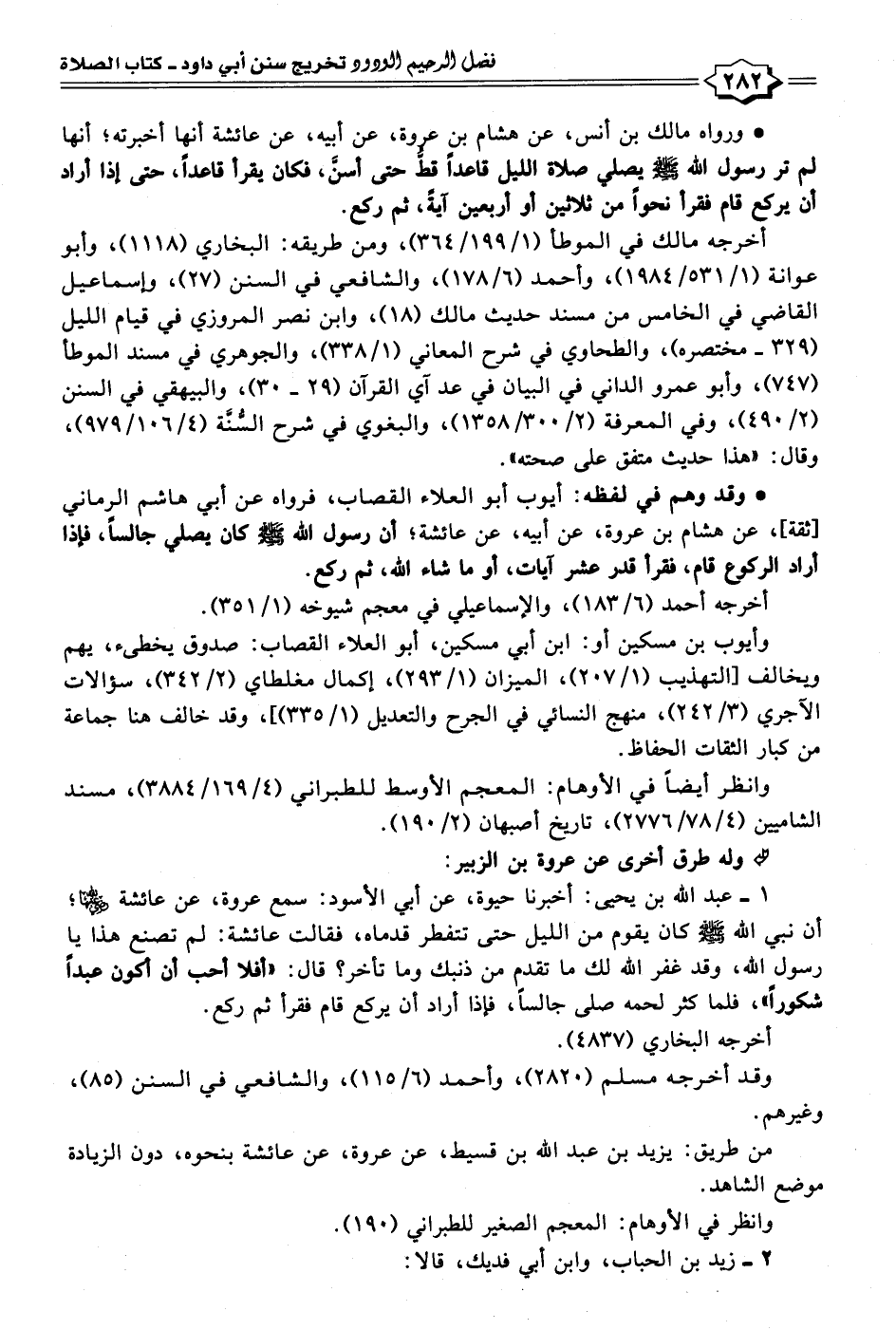 ١ - عبد الله بن يحيى: أخبرنا حيوة، عن أبي الأسود: سمع عروة، عن عائشة - رضي الله عنها -؛ أن نبي الله - صلى الله عليه وسلم - كان يقوم من الليل حتَّى تتفطر قدماه، فقالت عائشة: لم تصنع هذا يا رسول الله، وقد غفر الله لك ما تقدم من ذنبك وما تأخر؟ قال: "أفلا أحب أن أكون عبدًا شكورًا"، فلما كثر لحمه صلى جالسًا، فإذا أراد أن يركع قام فقرأ ثم ركع.