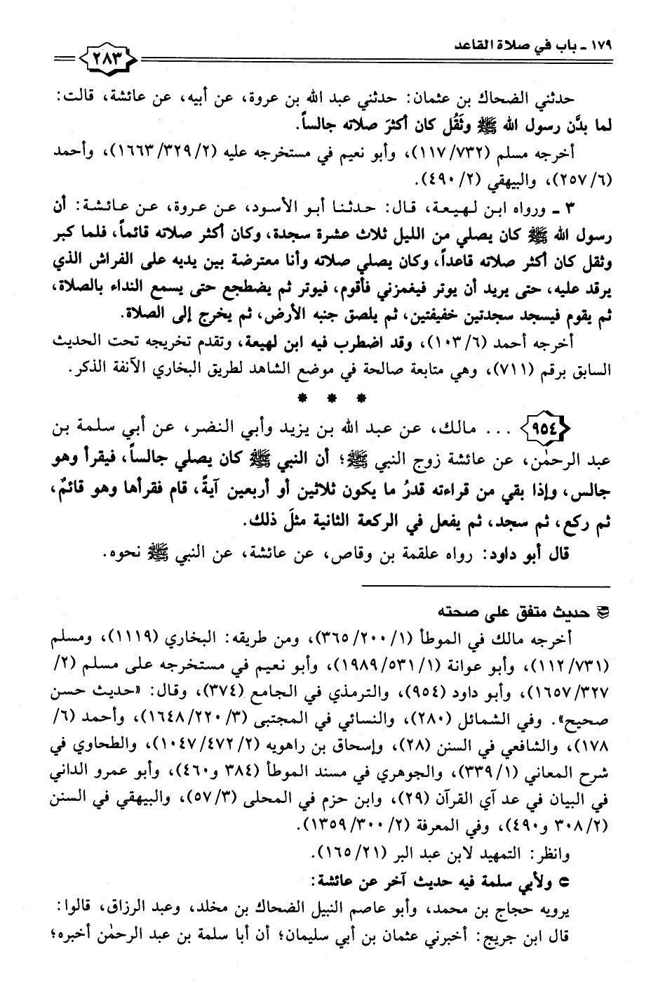 ٩٥٤ - . . . مالك، عن عبد الله بن يزيد وأبي النضر، عن أبي سلمة بن عبد الرحمن، عن عائشة زوج النبي - رضي الله عنها -؛ أن النبي - صلى الله عليه وسلم - كان يصلي جالسًا، فيقرأ وهو جالس، وإذا بقي من قراءته قدرُ ما يكون ثلاثين أو أربعين آيةً، قام فقرأها وهو قائمٌ، ثم ركع، ثم سجد، ثم يفعل في الركعة الثانية مثلَ ذلك.