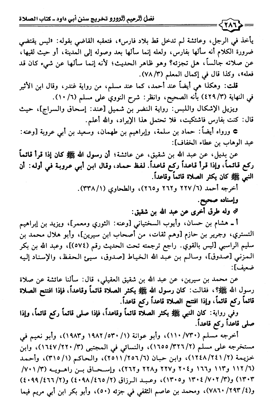 عن محمد بن سيرين، عن عبد الله بن شقيق العقيلي، قال: سألنا عائشة عن صلاة رسول الله - صلى الله عليه وسلم -؟، فقالت: كان رسول الله - صلى الله عليه وسلم - يكثر الصلاة قائمًا وقاعدًا، فإذا افتتح الصلاة قائمًا ركع قائمًا، وإذا افتتح الصلاة قاعدًا ركع قاعدًا.