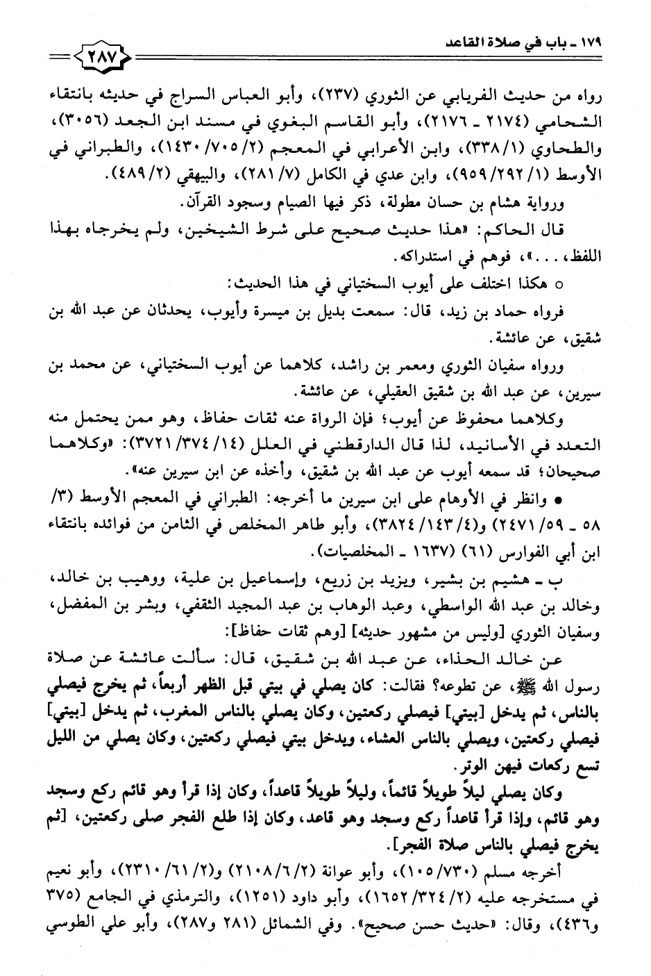 عن خالد الحذاء، عن عبد الله بن شقيق، قال: سألت عائشة عن صلاة رسول الله - صلى الله عليه وسلم -، عن تطوعه؟ فقالت: كان يصلي في بيتي قبل الظهر أربعًا، ثم يخرج فيصلي بالناس، ثم يدخل [بيتي]، فيصلي ركعتين، وكان يصلي بالناس المغرب، ثم يدخل [بيتي]، فيصلي ركعتين، ويصلي بالناس العشاء، ويدخل بيتي فيصلي ركعتين، وكان يصلي من الليل تسع ركعات فيهن الوتر.