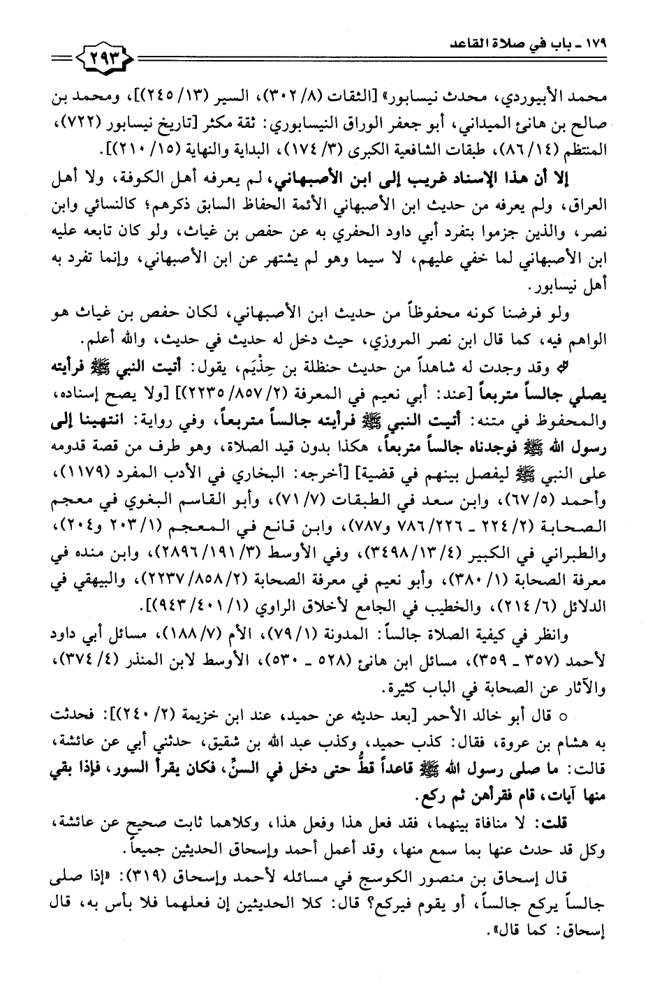 • وقد وجدت له شاهدًا من حديث حنظلة بن حِذْيَم، يقول: أتيت النبي - صلى الله عليه وسلم - فرأيته يصلي جالسًا متربعًا [عند: أبي نعيم في المعرفة (٢/ ٨٥٧/ ٢٢٣٥)] [ولا يصح إسناده، والمحفوظ في متنه: أتيت النبي - صلى الله عليه وسلم - فرأيته جالسًا متربعًا، وفي رواية: انتهينا إلى رسول الله - صلى الله عليه وسلم - فوجدناه جالسًا متربعًا، هكذا بدون قيد الصلاة، وهو طرف من قصة قدومه على النبي - صلى الله عليه وسلم - ليفصل بينهم في قضية] [أخرجه: البخاري في الأدب المفرد (١١٧٩)، وأحمد (٥/ ٦٧)، وابن سعد في الطبقات (٧/ ٧١)، وأبو القاسم البغوي في معجم الصحابة (٢/ ٢٢٤ - ٢٢٦/ ٧٨٦ و ٧٨٧)، وابن قانع في المعجم (١/ ٢٠٣ و ٢٠٤)، والطبراني في الكبير (٤/ ١٣ / ٣٤٩٨)، وفي الأوسط (٣/ ١٩١/ ٢٨٩٦)، وابن منده في معرفة الصحابة (١/ ٣٨٠)، وأبو نعيم في معرفة الصحابة (٢/ ٨٥٨/ ٢٢٣٧)، والبيهقي في الدلائل (٦/ ٢١٤)، والخطيب في الجامع لأخلاق الراوي (١/ ٤٠١/ ٩٤٣)].
