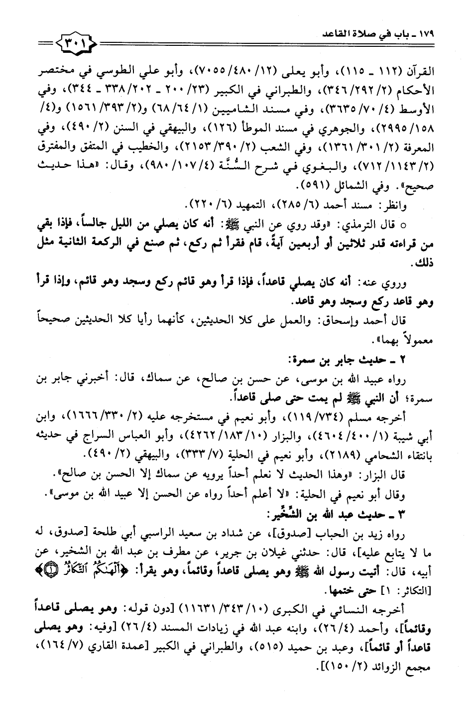 رواه زيد بن الحباب [صدوق]، عن شداد بن سعيد الراسبي أبي طلحة [صدوق، له ما لا يتابع عليه]، قال: حدثني غيلان بن جرير، عن مطرف بن عبد الله بن الشخير، عن أبيه، قال: أتيت رسول الله - صلى الله عليه وسلم - وهو يصلي قاعدًا وقائمًا، وهو يقرأ: {أَلْهَاكُمُ التَّكَاثُرُ (١)} [التكاثر: ١] حتَّى ختمها.