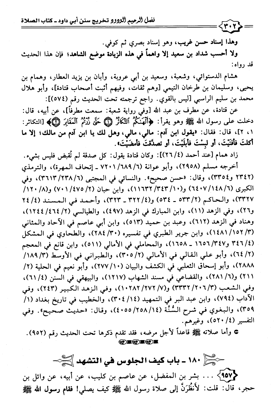 عن قتادة، عن مطرف بن عبد الله [وفي رواية شعبة: سمعت مطرفًا]، عن أبيه، قال: دخلت على رسول الله - صلى الله عليه وسلم - وهو يقرأ: {أَلْهَاكُمُ التَّكَاثُرُ (١) حَتَّى زُرْتُمُ الْمَقَابِرَ (٢)}: [التكاثر: ١، ٢]، قال: فقال: "يقول ابن آدم: مالي، مالي، وهل لك يا ابن آدم من مالك؛ إلا ما أكلتَ فأفنَيْتَ، أو لبِسْتَ فأبلَيْتَ، أو تصدَّقتَ فأمضَيْتَ".