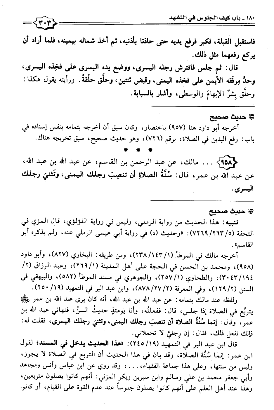 ٩٥٨ - . . . مالك، عن عبد الرحمن بن القاسم، عن عبد الله بن عبد الله، عن عبد الله بن عمر، قال: سُنَّةُ الصلاةِ أن تنصِبَ رجلك اليمنى، وتَثنيَ رجلك اليسرى.