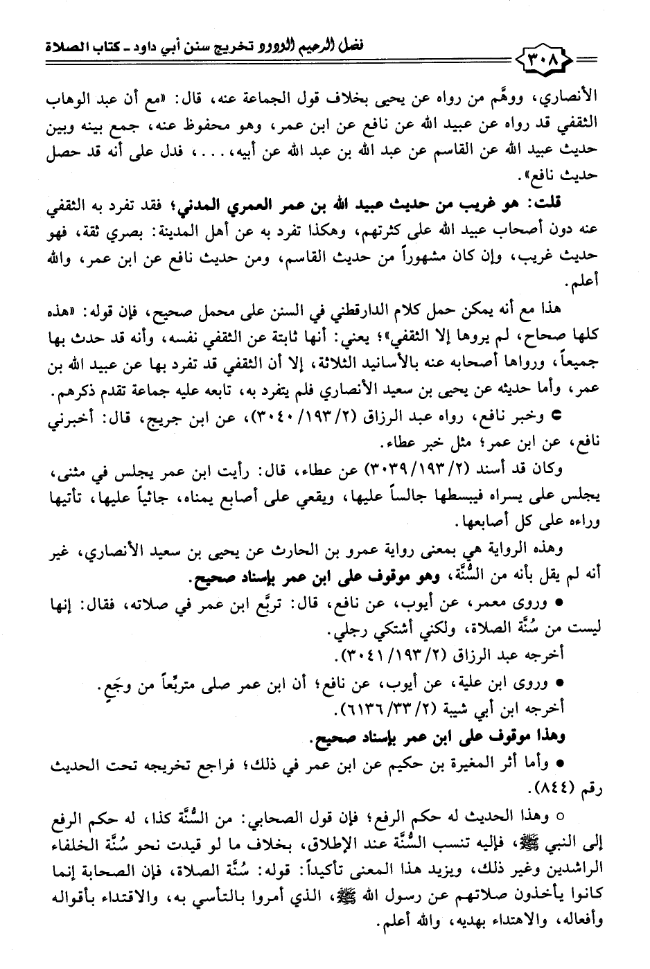 وكان قد أسند (٢/ ١٩٣/ ٣٠٣٩) عن عطاء، قال: رأيت ابن عمر يجلس في مثنى، يجلس على يسراه فيبسطها جالسًا عليها، ويقعي على أصابع يمناه، جاثيًا عليها، تأتيها وراءه على كل أصابعها.