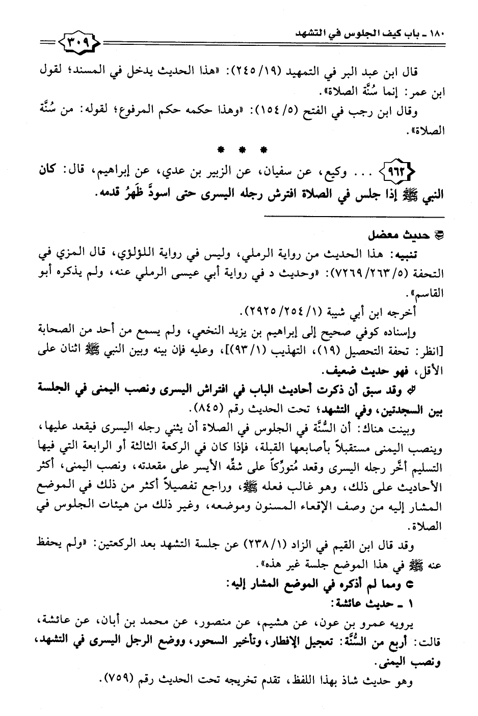 • وقد سبق أن ذكرت أحاديث الباب في افتراش اليسرى ونصب اليمنى في الجلسة بين السجدتين، وفي التشهد؛ تحت الحديث رقم (٨٤٥).
