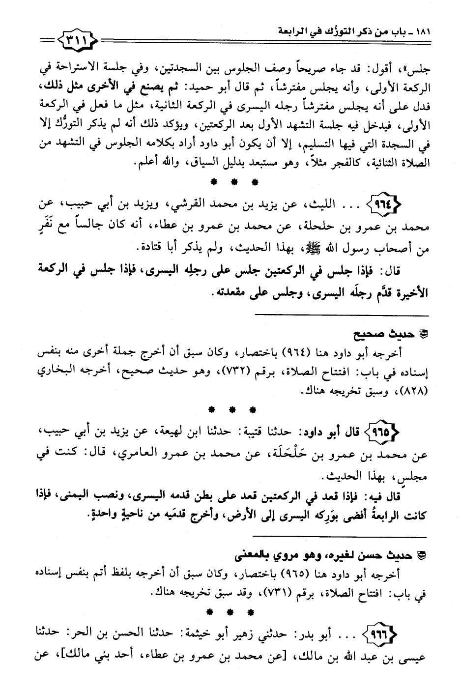 أخرجه أبو داود هنا (٩٦٥) باختصار، وكان سبق أن أخرجه بلفظ أتم بنفس إسناده في باب: افتتاح الصلاة، برقم (٧٣١)، وقد سبق تخريجه هناك.