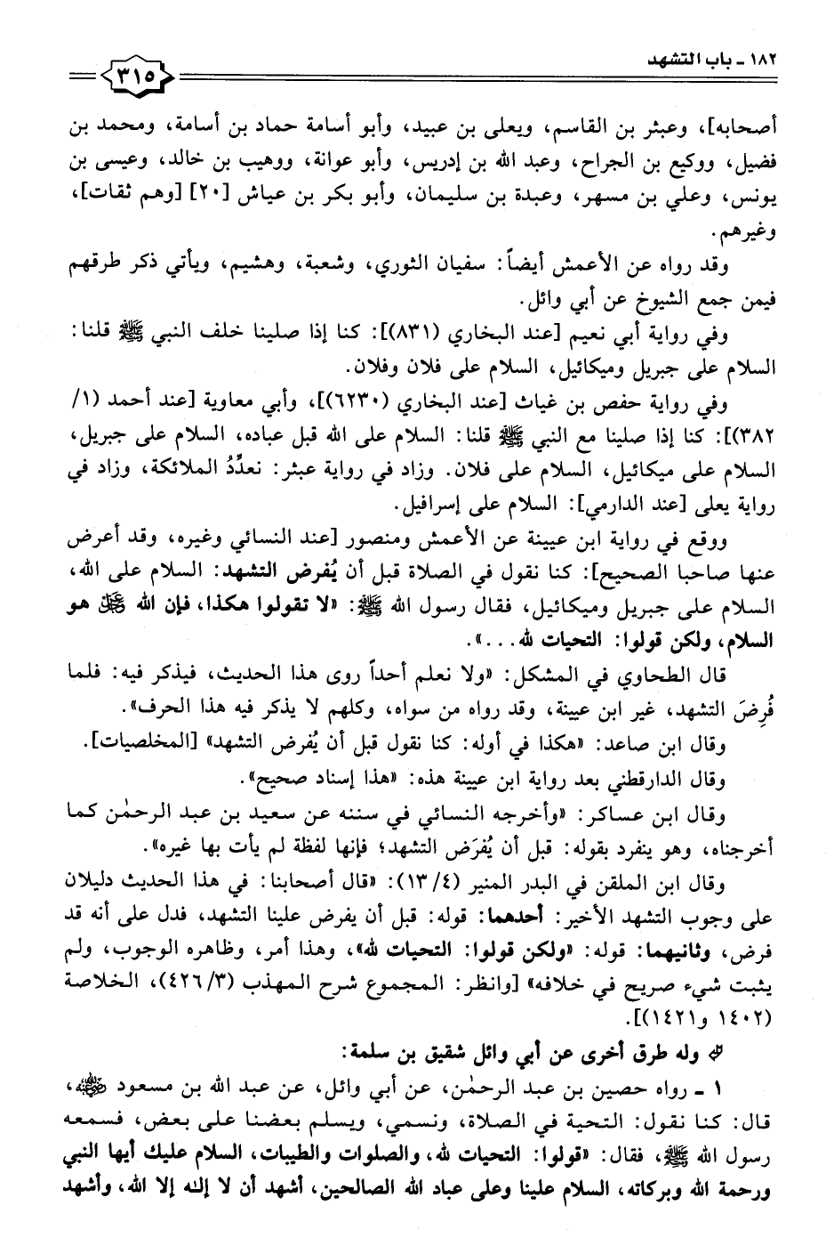 أ- رواه حصين بن عبد الرحمن، عن أبي وائل، عن عبد الله بن مسعود - رضي الله عنه -، قال: كنا نقول: التحية في الصلاة، ونسمي، ويسلم بعضنا على بعض، فسمعه رسول الله - صلى الله عليه وسلم -، فقال: "قولوا: التحيات لله، والصلوات والطيبات، السلام عليك أيها النبي ورحمة الله وبركاته، السلام علينا وعلى عباد الله الصالحين، أشهد أن لا إله إلا الله، وأشهد
