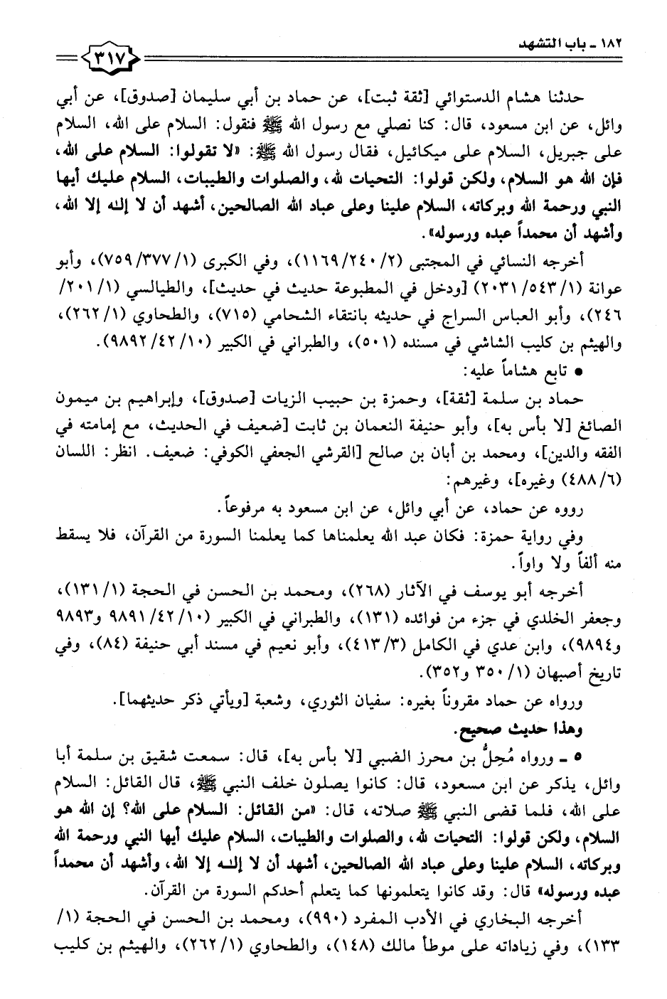 حدثنا هشام الدستوائي [ثقة ثبت]، عن حماد بن أبي سليمان [صدوق]، عن أبي وائل، عن ابن مسعود، قال: كنا نصلي مع رسول الله - صلى الله عليه وسلم - فنقول: السلام على الله، السلام على جبريل، السلام على ميكائيل، فقال رسول الله - صلى الله عليه وسلم -: "لا تقولوا: السلام على الله، فإن الله هو السلام، ولكن قولوا: التحيات لله، والصلوات والطيبات، السلام عليك أيها النبي ورحمة الله وبركاته، السلام علينا وعلى عباد الله الصالحين، أشهد أن لا إله إلا الله، وأشهد أن محمدًا عبده ورسوله".