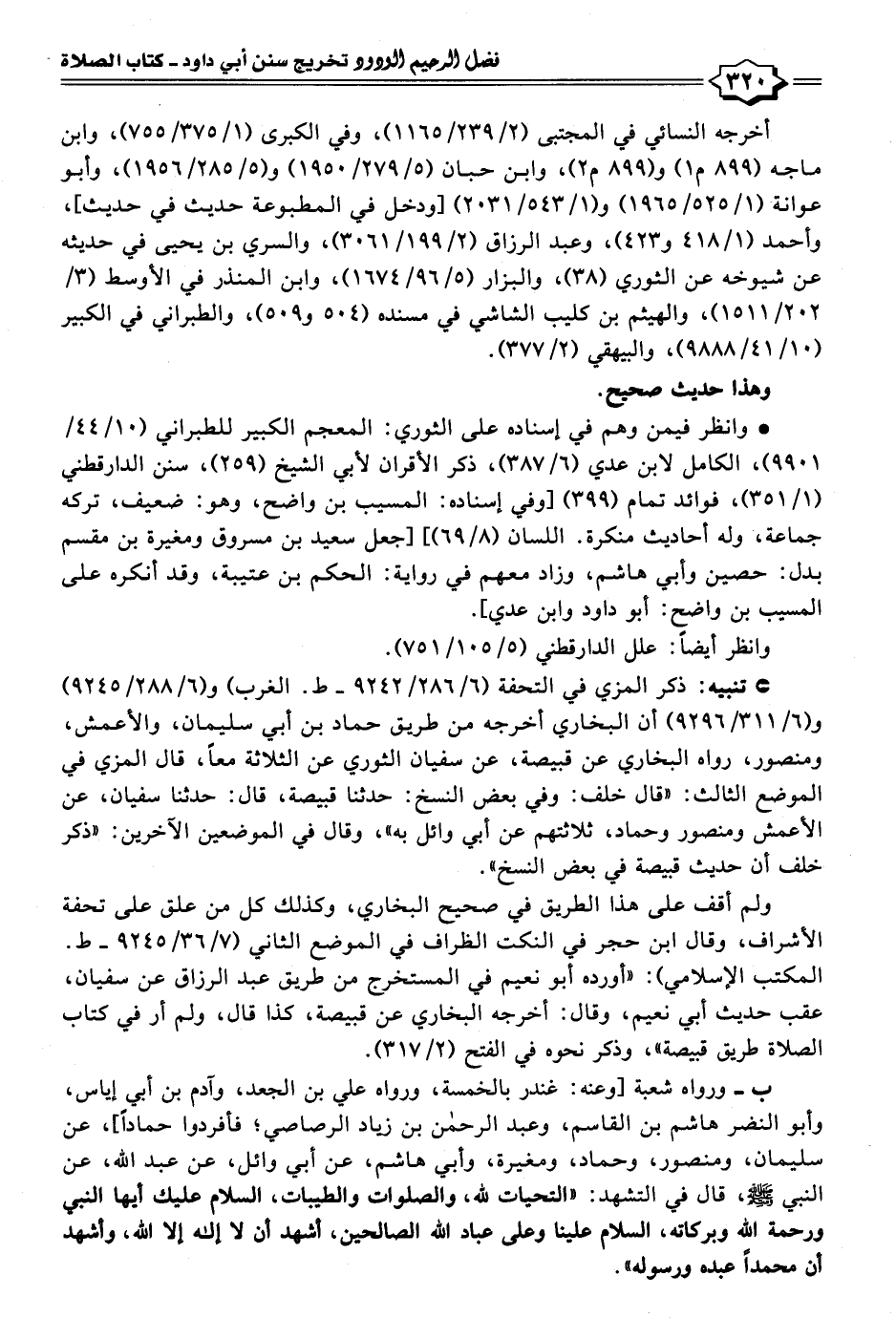 • وانظر فيمن وهم في إسناده على الثوري: المعجم الكبير للطبراني (١٠/ ٤٤/ ٩٩٠١)، الكامل لابن عدي (٦/ ٣٨٧)، ذكر الأقران لأبي الشيخ (٢٥٩)، سنن الدارقطني (١/ ٣٥١)، فوائد تمام (٣٩٩) [وفي إسناده: المسيب بن واضح، وهو: ضعيف، تركه جماعة، وله أحاديث منكرة. اللسان (٨/ ٦٩)] [جعل سعيد بن مسروق ومغيرة بن مقسم بدل: حصين وأبي هاشم، وزاد معهم في رواية: الحكم بن عتيبة، وقد أنكره على المسيب بن واضح: أبو داود وابن عدي].
