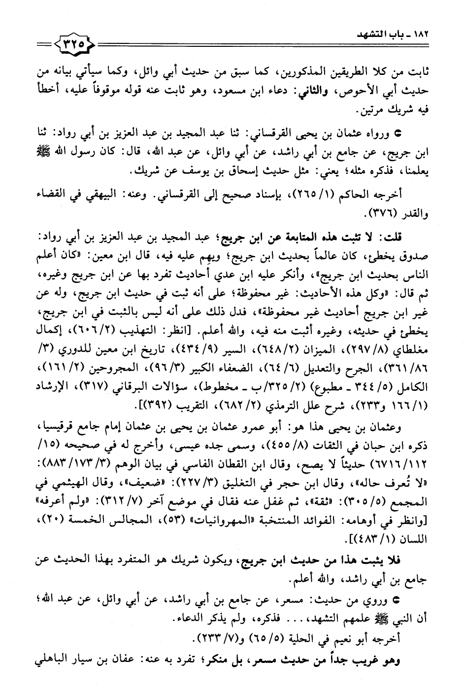 • ورواه عثمان بن يحيى القرقساني: ثنا عبد المجيد بن عبد العزيز بن أبي رواد: ثنا ابن جريج، عن جامع بن أبي راشد، عن أبي وائل، عن عبد الله، قال: كان رسول الله - صلى الله عليه وسلم - يعلمنا، فذكره مثله؛ يعني: مثل حديث إسحاق بن يوسف عن شريك.