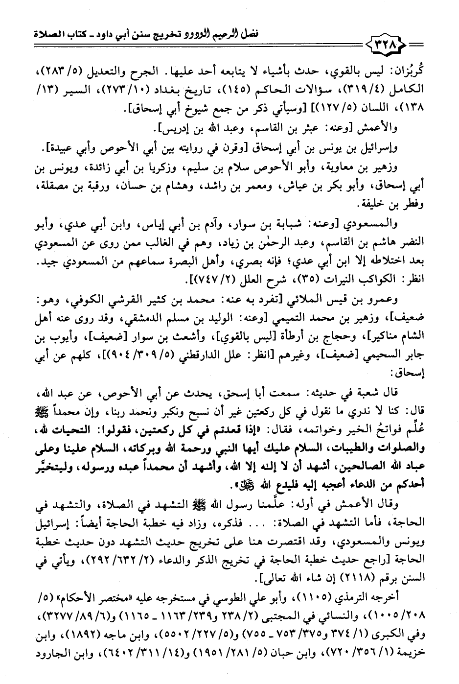 قال شعبة في حديثه: سمعت أبا إسحاق، يحدث عن أبي الأحوص، عن عبد الله، قال: كنا لا ندري ما نقول في كل ركعتين غير أن نسبح ونكبر ونحمد ربنا، وإن محمدًا - صلى الله عليه وسلم - عُلِّم فواتحُ الخير وخواتمه، فقال: "إذا قعدتم في كل ركعتين، فقولوا: التحيات لله، والصلوات والطيبات، السلام عليك أيها النبي ورحمة الله وبركاته، السلام علينا وعلى عباد الله الصالحين، أشهد أن لا إله إلا الله، وأشهد أن محمدًا عبده ورسوله، وليتخيَّر أحدكم من الدعاء أعجبه إليه فليدع الله عَزَّ وَجَلَّ".