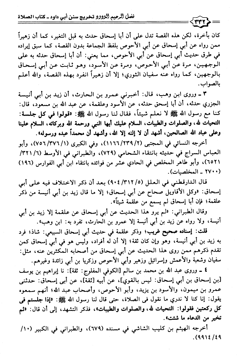 ٤ - وروى عبد الله بن محمَّد بن سالم [الكوفي المفلوج: ثقة]: نا إبراهيم بن يوسف [بن إسحاق بن أبي إسحاق: ليس بالقوي]، عن أبيه [ثقة]، عن أبي إسحاق: حدثني عمرو بن ميمون، والأسود بن يربد، وأبو الأحوص، وأصحاب عبد الله؛ أنهم سمعوه يقول: إنا كنا لا ندري ما نقول في الصلاة، حتى قال لنا رسول الله - صلى الله عليه وسلم -: "إذا جلستم في كل ركعتين فقولوا: التحيات لله، والصلوات والطيبات"، فذكر التشهد، إلى أن قال: "ثم تخير من الدعاء ما شئت".