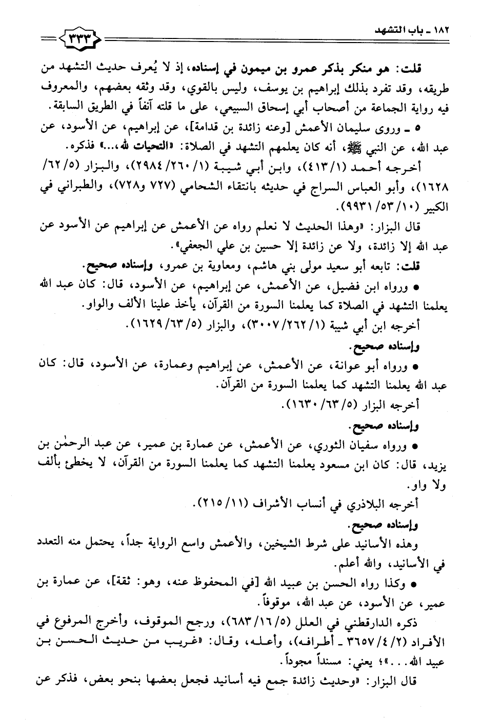 قلت: هو منكر بذكر عمرو بن ميمون في إسناده، إذ لا يُعرف حديث التشهد من طريقه، وقد تفرد بذلك إبراهيم بن يوسف، وليس بالقوي، وقد وثقه بعضهم، والمعروف فيه رواية الجماعة من أصحاب أبي إسحاق السبيعي، على ما قلته آنفًا في الطريق السابقة.
