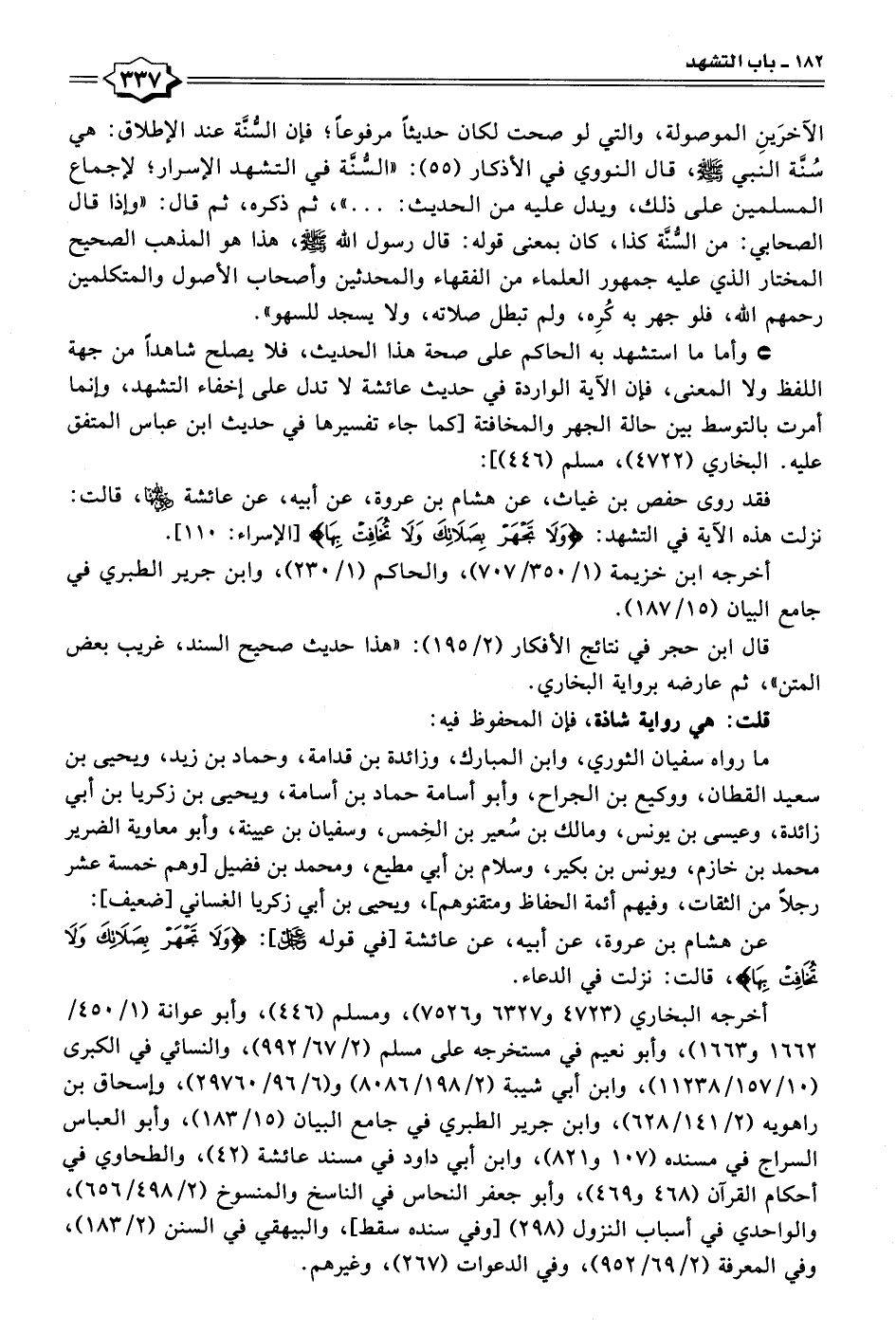 • وأما ما استشهد به الحاكم على صحة هذا الحديث، فلا يصلح شاهدًا من جهة اللفظ ولا المعنى، فإن الآية الواردة في حديث عائشة لا تدل على إخفاء التشهد، وإنما أمرت بالتوسط بين حالة الجهر والمخافتة [كما جاء تفسيرها في حديث ابن عباس المتفق عليه. البخاري (٤٧٢٢)، مسلم (٤٤٦)]: