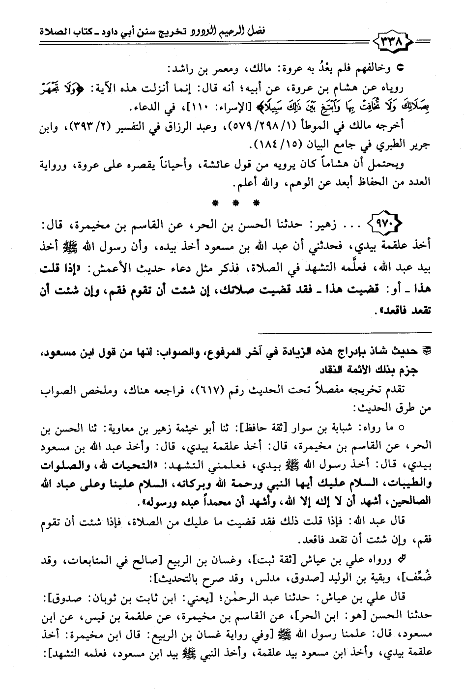 • ما رواه: شبابة بن سوار [ثقة حافظ]: ثنا أبو خيثمة زهير بن معاوية: ثنا الحسن بن الحر، عن القاسم بن مخيمرة، قال: أخذ علقمة بيدي، قال: وأخذ عبد الله بن مسعود بيدي، قال: أخذ رسول الله - صلى الله عليه وسلم - بيدي، فعلمني التشهد: "التحيات لله، والصلوات والطيبات، السلام عليك أيها النبي ورحمة الله وبركاته، السلام علينا وعلى عباد الله الصالحين، أشهد أن لا إله إلا الله، وأشهد أن محمدًا عبده ورسوله".