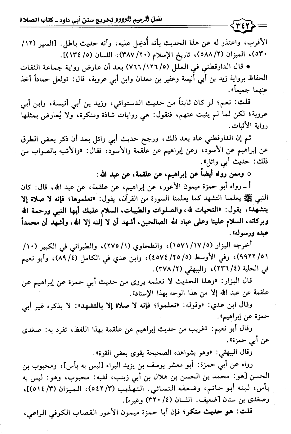 وقال ابن عدي: "وقوله: "تعلموا؛ فإنه لاصلاة إلا بالتشهد": لا يذكره غير أبي حمزة عن إبراهيم".