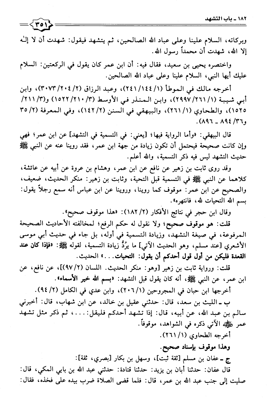 ب- الليث بن سعد، قال: حدثني عقيل بن خالد، عن ابن شهاب، قال: أخبرني سالم بن عبد الله، عن أبيه، قال: إذا تشهد أحدكم فليقل: ... ، ثم ذكر مثل تشهد عمر - رضي الله عنه - الآتي ذكره في الشواهد، موقوفًا.