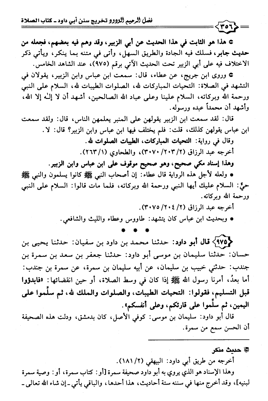 ٩٧٥ - قال أبو داود: حدثنا محمَّد بن داود بن سفيان: حدثنا يحيى بن حسان: حدثنا سليمان بن موسى أبو داود: حدثنا جعفر بن سعد بن سمرة بن جندب: حدثني خبيب بن سليمان، عن أبيه سليمان بن سمرة، عن سمرة بن جندب: أما بعدُ، أمرنا رسول الله - صلى الله عليه وسلم - إذا كان في وسط الصلاة، أو حين انقضائها: "فابدؤوا قبل التسليم، فقولوا: التحيات الطيبات، والصلوات والملك لله، ثم سلِّموا على اليمين، ثم سلِّموا على قارئكم، وعلى أنفسكم".