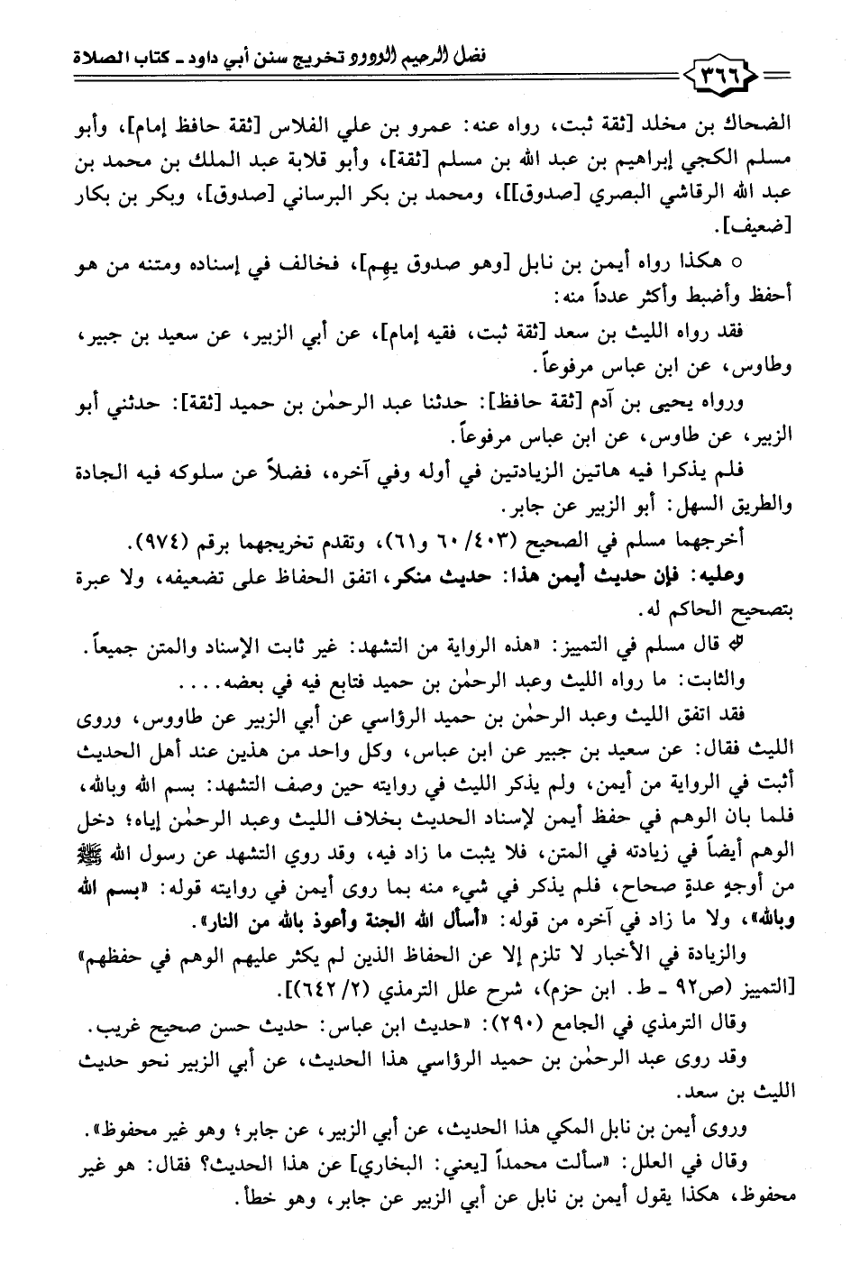 فقد اتفق الليث وعبد الرحمن بن حميد الرؤاسي عن أبي الزبير عن طاووس، وروى الليث فقال: عن سعيد بن جبير عن ابن عباس، وكل واحد من هذين عند أهل الحديث أثبت في الرواية من أيمن، ولم يذكر الليث في روايته حين وصف التشهد: بسم الله وبالله، فلما بان الوهم في حفظ أيمن لإسناد الحديث بخلاف الليث وعبد الرحمن إياه؛ دخل الوهم أيضًا في زيادته في المتن، فلا يثبت ما زاد فيه، وقد روي التشهد عن رسول الله - صلى الله عليه وسلم - من أوجهٍ عدةٍ صحاح، فلم يذكر في شيء منه بما روى أيمن في روايته قوله: "بسم الله وبالله"، ولا ما زاد في آخره من قوله: "أسأل الله الجنة وأعوذ بالله من النار".