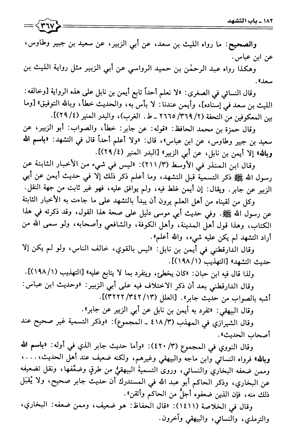 وقال حمزة بن محمد الحافظ: "قوله: عن جابر: خطأ، والصواب: أبو الزبير، عن سعيد بن جبير وطاوس، عن ابن عباس"، قال: "ولا أعلم أحدًا قال في التشهد: "باسم الله وبالله" إلا أيمن بن نابل، عن أبي الزبير" [البدر المنير (٤/ ٢٩)].
