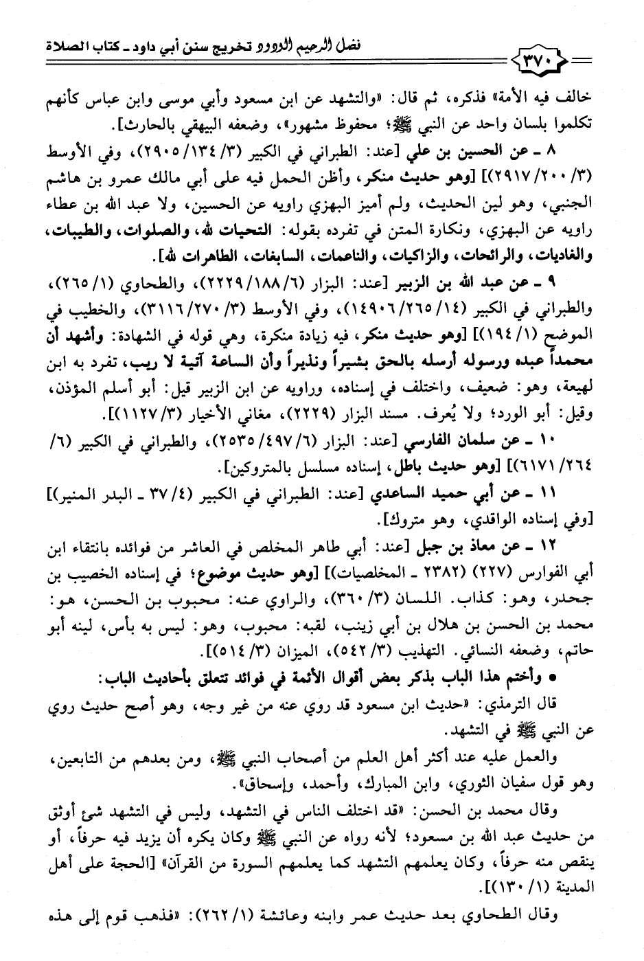 ٨ - عن الحسين بن علي [عند: الطبراني في الكبير (٣/ ١٣٤/ ٢٩٠٥)، وفي الأوسط (٣/ ٢٠٠/ ٢٩١٧)] [وهو حديث منكر، وأظن الحمل فيه على أبي مالك عمرو بن هاشم الجنبي، وهو لين الحديث، ولم أميز البهزي راويه عن الحسين، ولا عبد الله بن عطاء راويه عن البهزي، ونكارة المتن في تفرده بقوله: التحيات لله، والصلوات، والطيبات، والغاديات، والرائحات، والزاكيات، والناعمات، السابغات، الطاهرات لله].