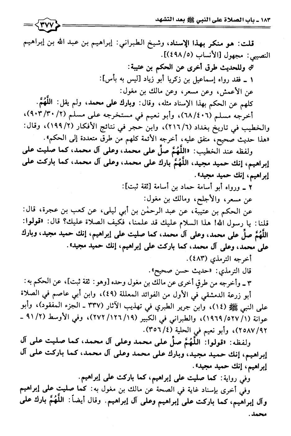 وفي أخرى بإسناد غاية في الصحة عن مالك بن مغول به: كما صليت على إبراهيم وآل إبراهيم، كما باركت على إبراهيم وعلى آل إبراهيم. وقال أيضًا: اللهم بارك على محمد.