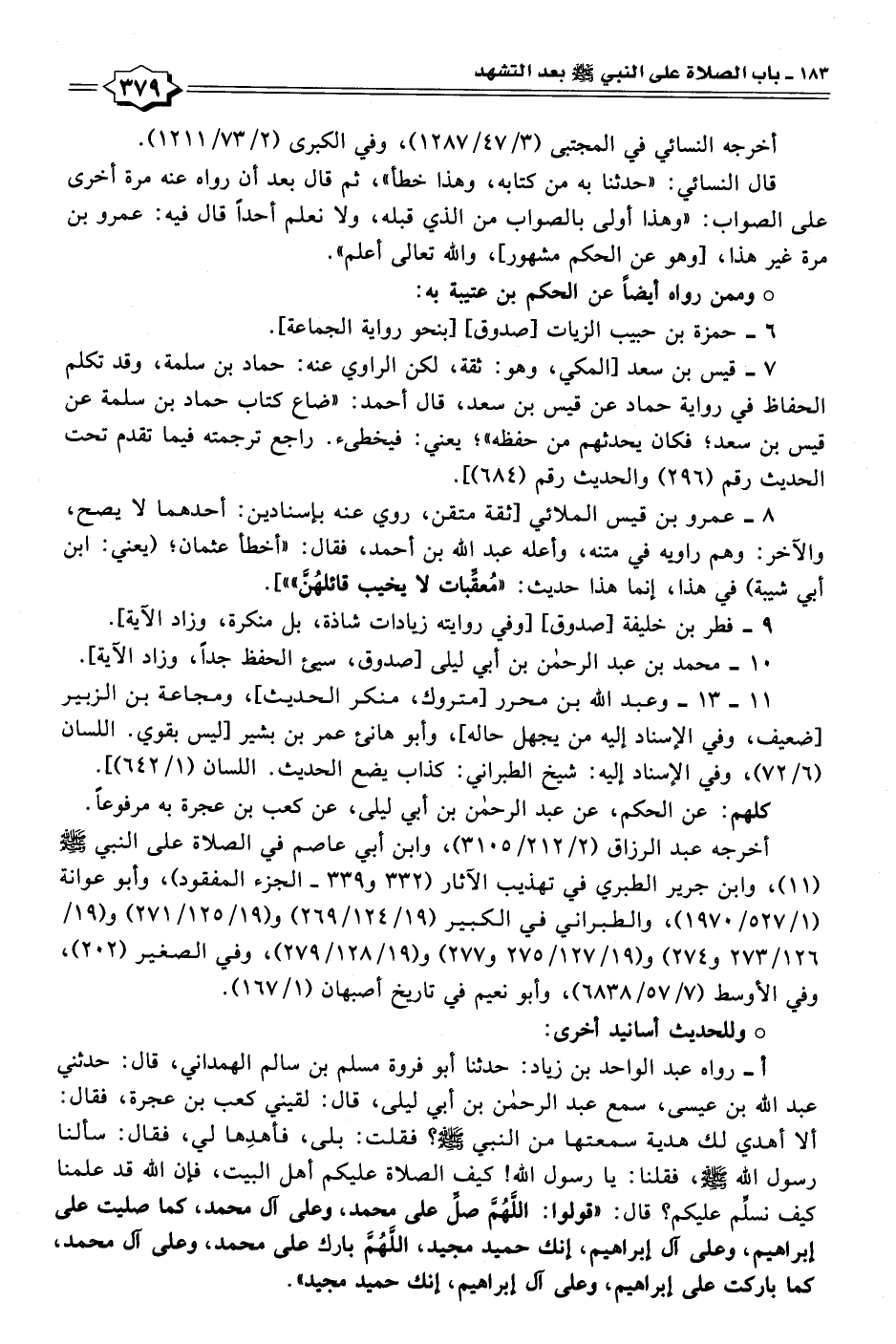 أ- رواه عبد الواحد بن زياد: حدثنا أبو فروة مسلم بن سالم الهمداني، قال: حدثني عبد الله بن عيسى، سمع عبد الرحمن بن أبي ليلى، قال: لقيني كعب بن عجرة، فقال: ألا أهدي لك هدية سمعتها من النبي - صلى الله عليه وسلم -؟ فقلت: بلى، فأهدِها لي، فقال: سألنا رسول الله - صلى الله عليه وسلم -، فقلنا: يا رسول الله! كيف الصلاة عليكم أهل البيت، فإن الله قد علمنا كيف نسلِّم عليكم؟ قال: "قولوا: اللَّهُمَّ صل على محمد، وعلى آل محمد، كما صليت على إبراهيم، وعلى آل إبراهيم، إنك حميد مجيد، اللهم بارك على محمد، وعلى آل محمد، كما باركت على إبراهيم، وعلى آل إبراهيم، إنك حميد مجيد".