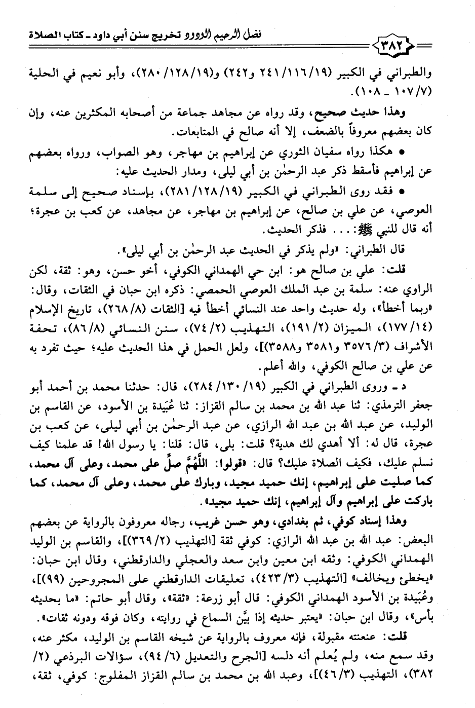 د- وروى الطبراني في الكبير (١٩/ ١٣٠/ ٢٨٤)، قال: حدثنا محمد بن أحمد أبو جعفر الترمذي: ثنا عبد الله بن محمد بن سالم القزاز: ثنا عُبَيدة بن الأسود، عن القاسم بن الوليد، عن عبد الله بن عبد الله الرازي، عن عبد الرحمن بن أبي ليلى، عن كعب بن عجرة، قال له: ألا أهدي لك هدية؟ قلت: بلى، قال: قلنا: يا رسول الله! قد علمنا كيف نسلم عليك، فكيف الصلاة عليك؟ قال: "قولوا: اللهُمَّ صلِّ على محمد، وعلى آل محمد، كما صليت على إبراهيم، إنك حميد مجيد، وبارك على محمد، وعلى آل محمد، كما باركت على إبراهيم وآل إبراهيم، إنك حميد مجيد".