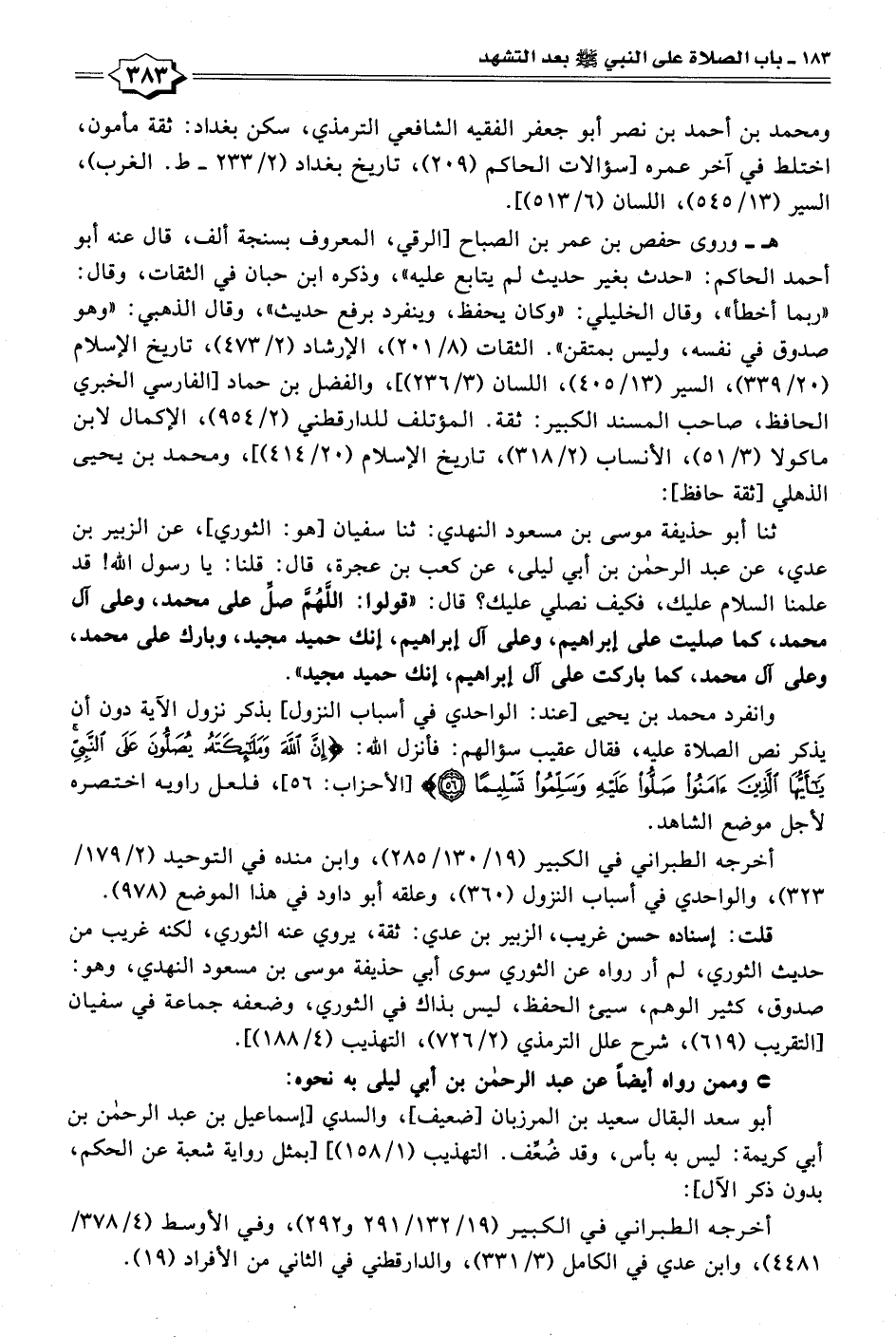 ثنا أبو حذيفة موسى بن مسعود النهدي: ثنا سفيان [هو: الثوري]، عن الزبير بن عدي، عن عبد الرحمن بن أبي ليلى، عن كعب بن عجرة، قال: قلنا: يا رسول الله! قد علمنا السلام عليك، فكيف نصلي عليك؟ قال: "قولوا: اللهم صل على محمد، وعلى آل محمد، كما صليت على إبراهيم، وعلى آل إبراهيم، إنك حميد مجيد، وبارك على محمد، وعلى آل محمد، كما باركت على آل إبراهيم، إنك حميد مجيد".