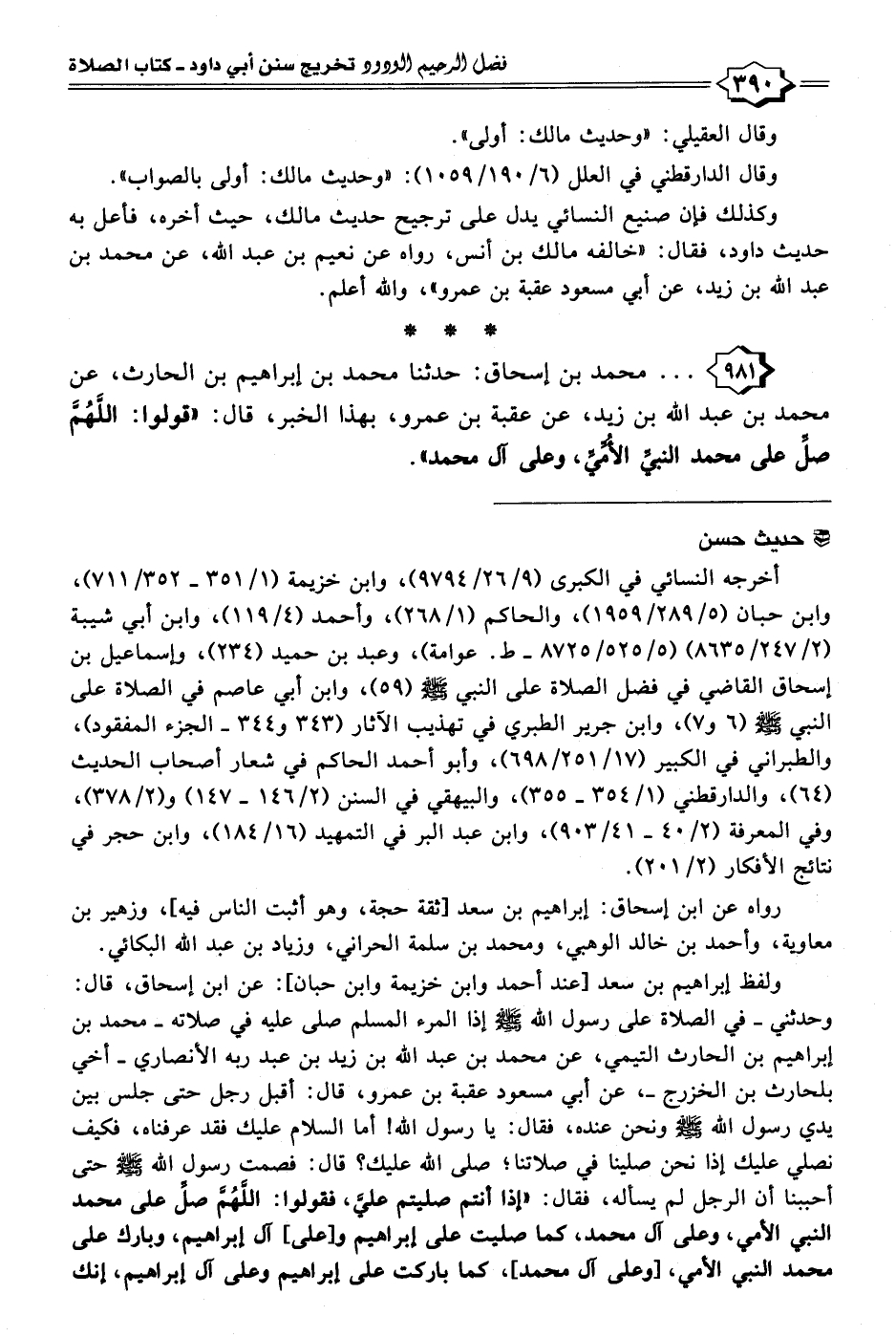 أخرجه النسائي في الكبرى (٩/ ٢٦/ ٩٧٩٤)، وابن خزيمة (١/ ٣٥١ - ٣٥٢/ ٧١١)، وابن حبان (٥/ ٢٨٩/ ١٩٥٩)، والحاكم (١/ ٢٦٨)، وأحمد (٤/ ١١٩)، وابن أبي شيبة (٢/ ٢٤٧/ ٨٦٣٥) (٥/ ٥٢٥/ ٨٧٢٥ - ط. عوامة)، وعبد بن حميد (٢٣٤)، وإسماعيل بن إسحاق القاضي في فضل الصلاة على النبي - صلى الله عليه وسلم - (٥٩)، وابن أبي عاصم في الصلاة على النبي - صلى الله عليه وسلم - (٦ و ٧)، وابن جرير الطبري في تهذيب الآثار (٣٤٣ و ٣٤٤ - الجزء المفقود)، والطبراني في الكبير (١٧/ ٢٥١/ ٦٩٨)، وأبو أحمد الحاكم في شعار أصحاب الحديث (٦٤)، والدارقطني (١/ ٣٥٤ - ٣٥٥)، والبيهقي في السنن (٢/ ١٤٦ - ١٤٧) و (٢/ ٣٧٨)، وفي المعرفة (٢/ ٤٠ - ٤١/ ٩٠٣)، وابن عبد البر في التمهيد (١٦/ ١٨٤)، وابن حجر في نتائج الأفكار (٢/ ٢٠١).
