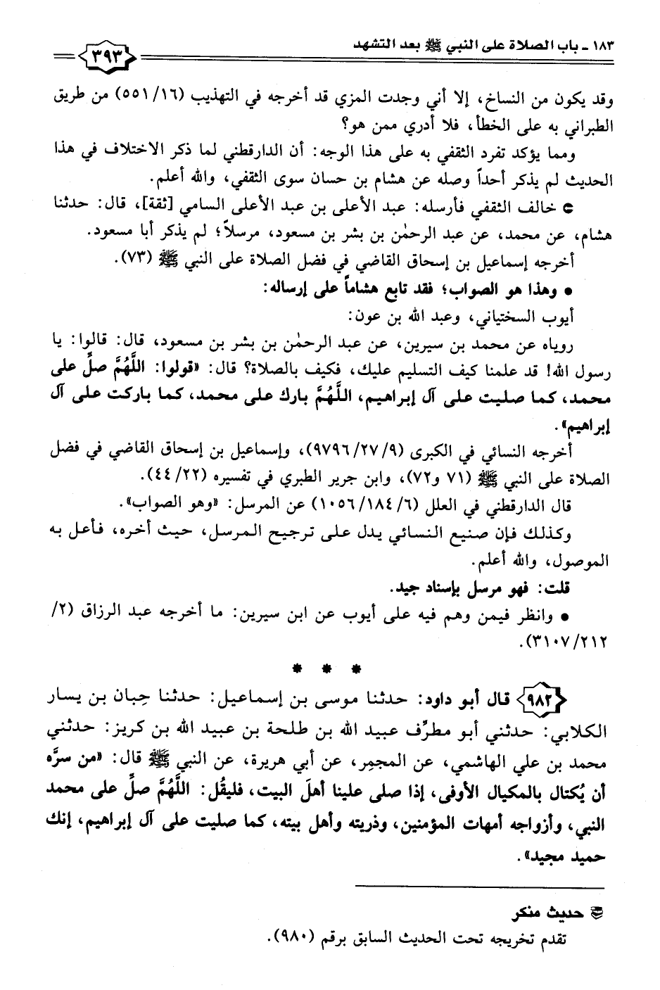 ٩٨٢ - قال أبو داود: حدثنا موسى بن إسماعيل: حدثنا حِبان بن يسار الكلابي: حدثني أبو مطرِّف عبيد الله بن طلحة بن عبيد الله بن كريز: حدثني محمد بن علي الهاشمي، عن المجمِر، عن أبي هريرة، عن النبي - صلى الله عليه وسلم - قال: "من سرَّه أن يُكتال بالمكيال الأوفى، إذا صلى علينا أهلَ البيت، فليقُل: اللهم صل على محمد النبي، وأزواجه أمهات المؤمنين، وذريته وأهل بيته، كما صليت على آل إبراهيم، إنك حميد مجيد".