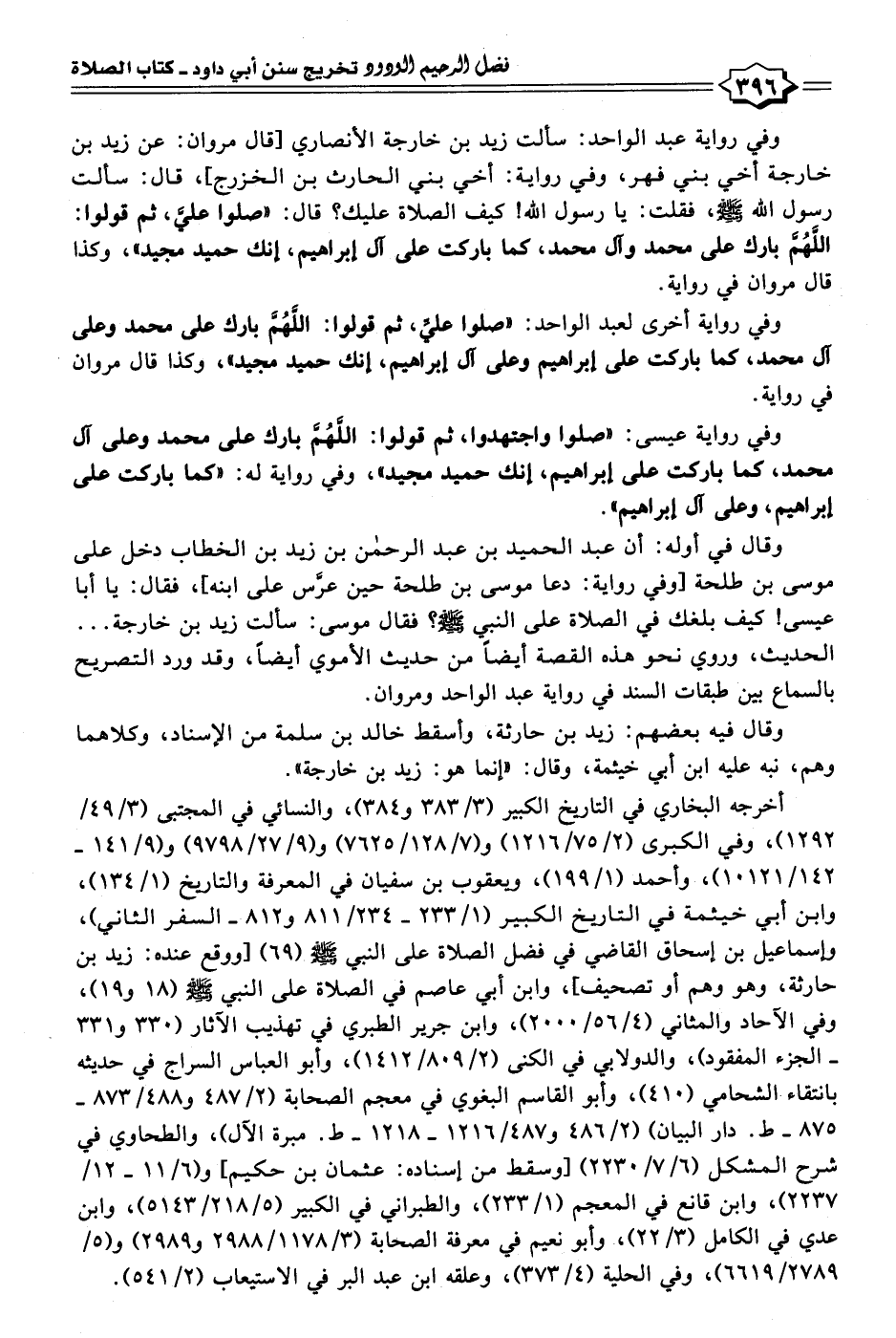 وفي رواية عبد الواحد: سألت زيد بن خارجة الأنصاري [قال مروان: عن زيد بن خارجة أخي بني فهر، وفي رواية: أخي بني الحارث بن الخزرج]، قال: سألت رسول الله - صلى الله عليه وسلم -، فقلت: يا رسول الله! كيف الصلاة عليك؟ قال: "صلوا عليَّ، ثم قولوا: اللهم بارك على محمد وآل محمد، كما باركت على آل إبراهيم، إنك حميد مجيد"، وكذا قال مروان في رواية.