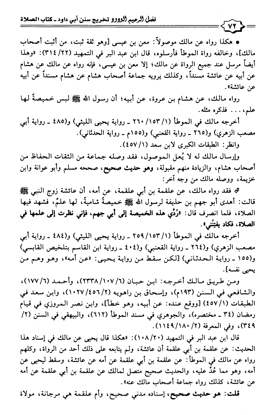 • فقد رواه مالك، عن علقمة بن أبي علقمة، عنٍ أمه، أن عائشة زوج النبي - صلى الله عليه وسلم - قالت: أهدى أبو يهم بن حذيفة لرسول الله - صلى الله عليه وسلم - خميصةً شاميةً، لها علمٌ، فشهد فيها الصلاة، فلما انصرف قال: "رُدِّي هذه الخميصة إلى أبي جهم، فإني نظرت إلى علمها في الصلاة فكاد يفتِنُني".